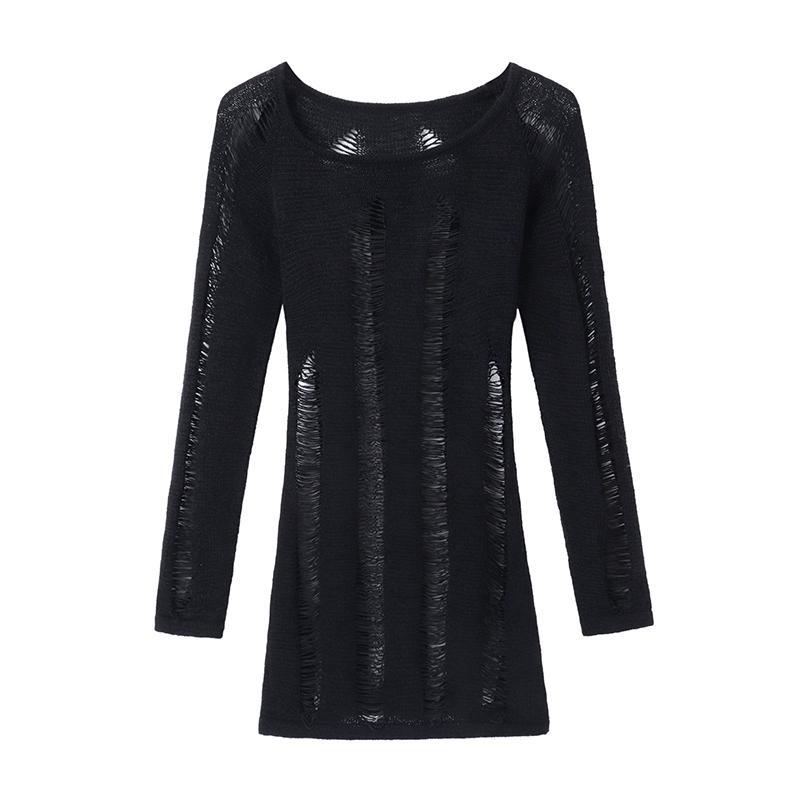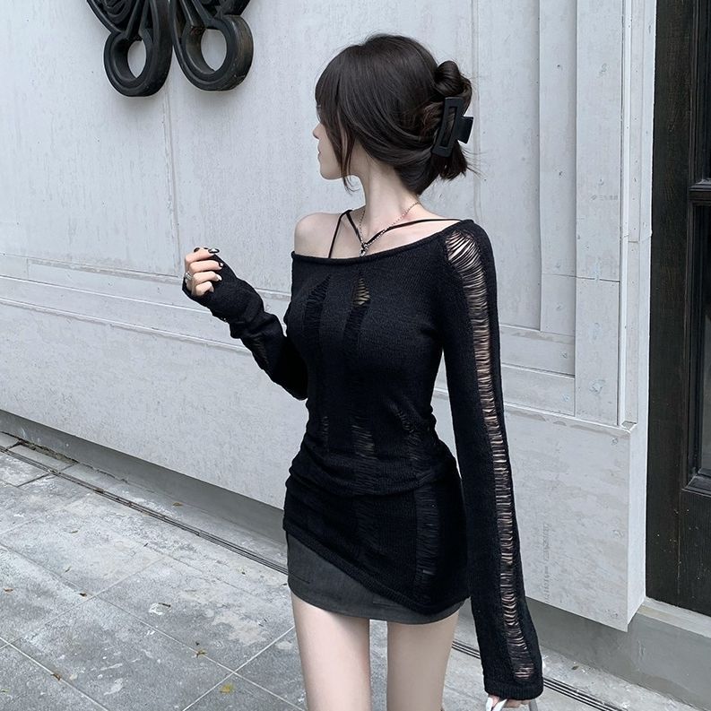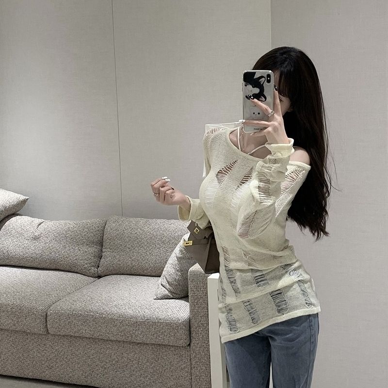 Винтажный ажурный вязаный свитер женский Harajuku тонкий джемпер с открытыми плечами корейский топ с длинным рукавом Kpop гранж