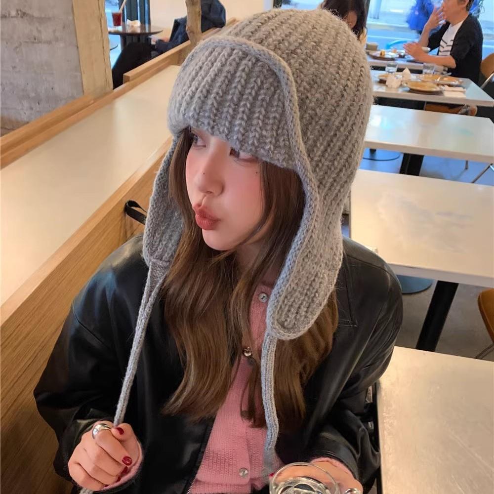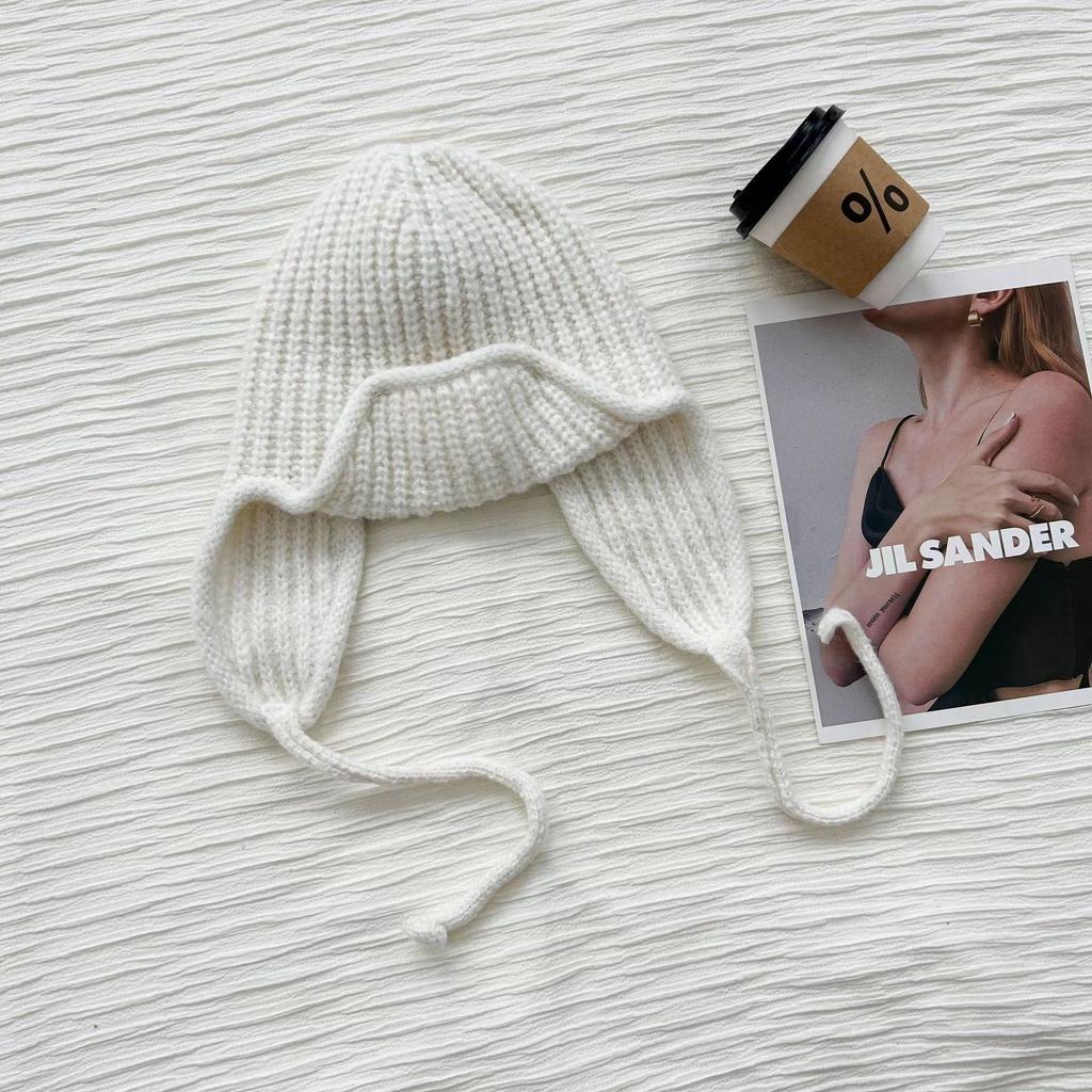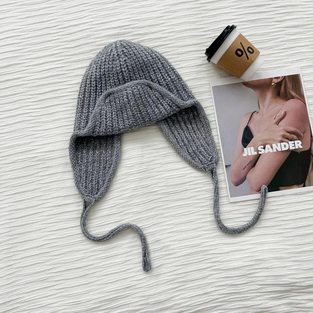 Маленькая однотонная вязаная шерстяная шапка-леталка со шнуровкой, женская зимняя универсальная защитная ухо для студента Lei Feng