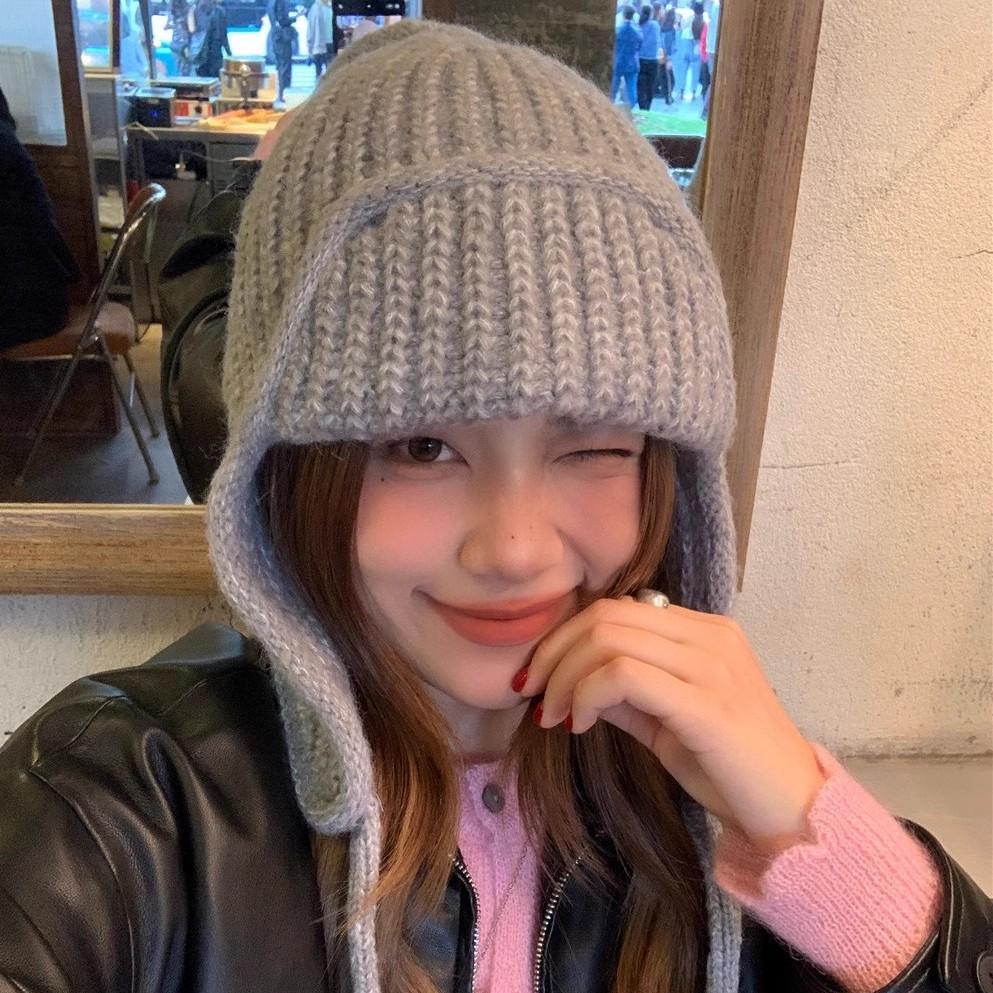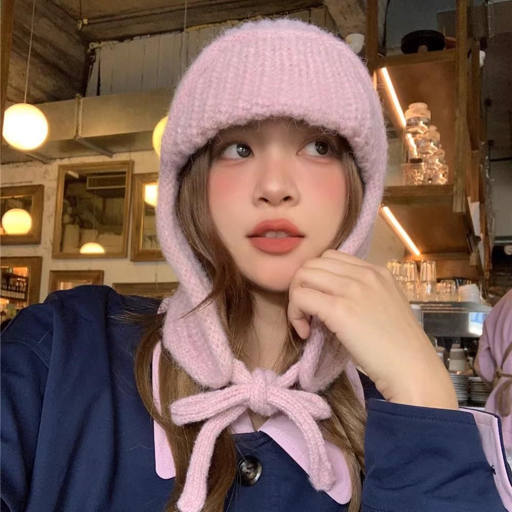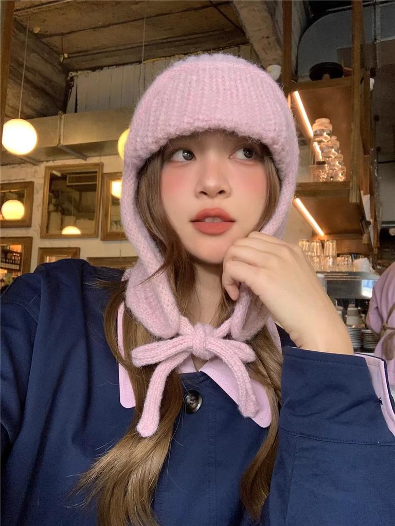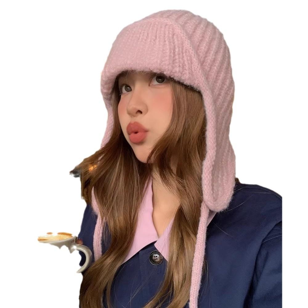 Маленькая однотонная вязаная шерстяная шапка-леталка со шнуровкой, женская зимняя универсальная защитная ухо для студента Lei Feng