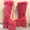 Зимние женские зимние сапоги на платформе с танкеткой и высоким каблуком из искусственного меха, женские плюшевые теплые нескользящие сапоги до середины голени, готическая обувь