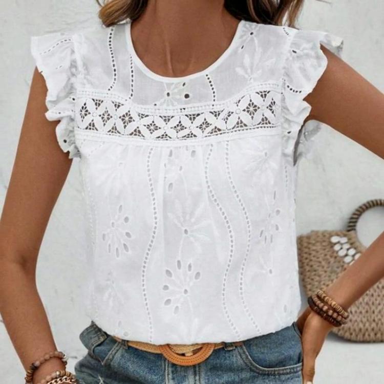 Летняя белая кружевная рубашка с круглым вырезом и оборками, женская свободная повседневная модная универсальная футболка-пуловер, женская футболка без рукавов