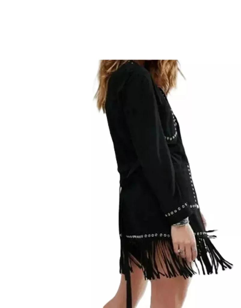 Женская замшевая кожаная куртка, черная, с заклепками и бахромой, длинная, стильная, ручная работа