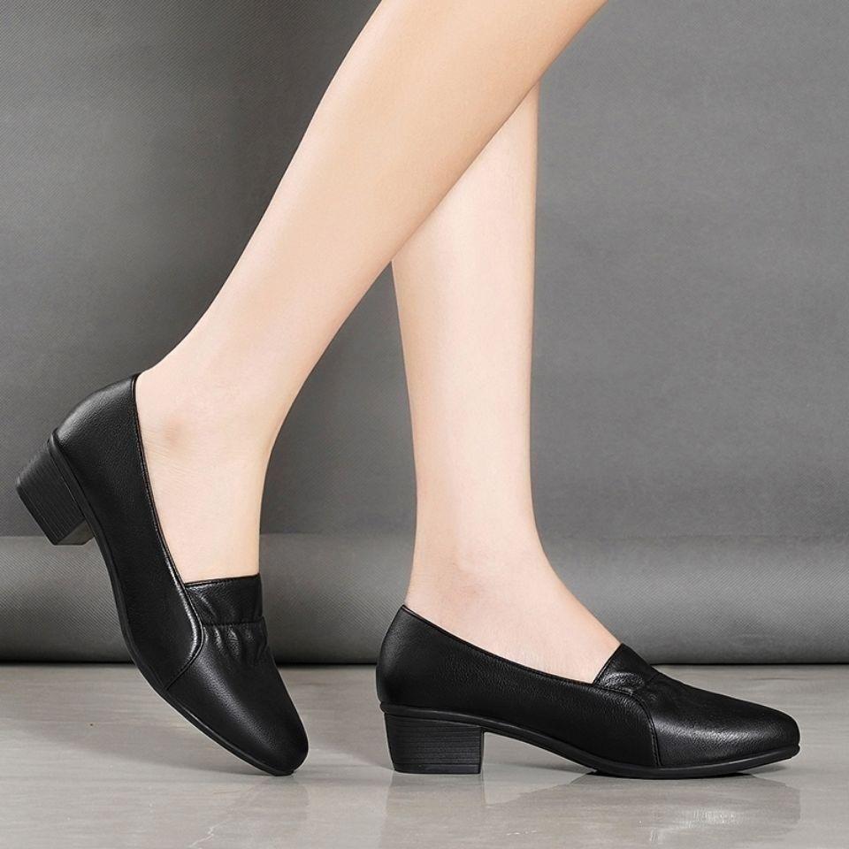 Туфли из мягкой кожи с открытым носком, женские нескользящие рабочие туфли на толстом каблуке и мягкой подошве на среднем каблуке, женская кожаная обувь