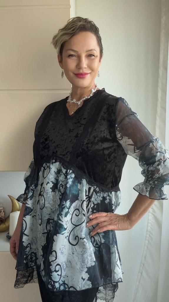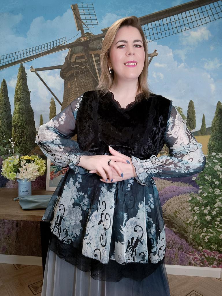 ШИКАРНАЯ БЛУЗА -ТУНИКА от магазина 21Top🖤 Привет. Как же я люблю вещи, где смешаны разные ткани! И эта роскошная блуза снова дала мне такой повод. Здесь много ткани и сложный крой. А также отличная длина благородная и универсальная расцветка. А теперь к подробностям. Блуза расклешается низу. Основной материал тут летящий шифон: Шифоновые рукава, на манжетах резинки и кокетливая рюшка. Шифоновая нижняя часть от груди. Она свободная, ткани много, идёт своеобразной юбочкой. Под этой "юбочкой" есть подклад из плотной черной гладкой ткани. Подклад немного длиннее, по низу пришито широкое кружево. А вот верхняя часть словно из велюра. Она контрастного черного цвета. Лоснится. Зрительно выглядит,как унороченная жилетка. Эта часть расшита кружевом. Выглядит дорого. Мне нравится дизайнерская задумка по контрастной вставке -жилетке. Она пришита клином под грудью, помогает зрительно вытянуть силуэт. Материал полиэстер. Написано, что с добавлением хлопка, возможно. Во всяком случае, блуза очень приятная к телу. Легко гладится, не мнется. В ней максимально комфортно. Пошив фабричный, все качественно. Представлена у продавца в одной расцветке. Размеры: M - 4XL Я выбрала максимальный размер. Мне блуза слегка велика. Мой рост 173см. ОГ 98см. ОТ 89см. ОБ 110см. Размер одежды 50 -52 Замеры в размере 4XL: 🪈длина 85см 🪈плечи 45см 🪈длина рукава 60см 🪈ОГ 120- 124см 🪈ОТ 120- 130см Блуза-туника совершенно потрясающая! С ней не слолно придумывать нарядные образы - она сама по себе такая!🖤 Хорошо скрывает животик и прикрывает паховую зону. Это дополнительные плюсы. Рекомендую, девочки ✅ Если вам по душе такие вещи - не стоит думать долго- раскупят 😉 #elena_likui #21_Top #женский_гардероб