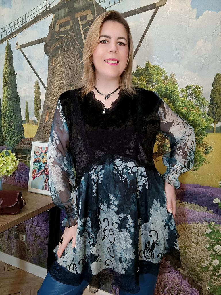 Нарядная блуза- туника ✔️Расцветка одна, размеры М-4xl. Мои параметры: 167, 98-85-100. Выбрала размер 2XL. По размеру идеально. ✔️Фасон: Отрезная под грудью Рукава с резинками на манжетах Нижняя часть состоит из двух слоев: цветной, полупрозрачный шифон, и гладкая, черная часть с кружевом Вырез V- образный Горловина, лиф, и низ, украшены кружевом ✔️Ткань: Заявлен полиэстер и хлопок Этикетки с составом нет, полагаю, что блуза из синтетики, но не противной, приятной на ощупь. Лиф из искусственного бархата, хорошо тянется Шифон не тянется Нижняя, черная ткань тянется умеренно. ✔️Пошив фабричный. 📐Замеры: Плечи 40 Длина рукава от горловины 68 Длина рукава 59 Ширина рукава в предплечье 16 ОГ подмышками 112 ОТ 106 ОБ 140 Длина 86