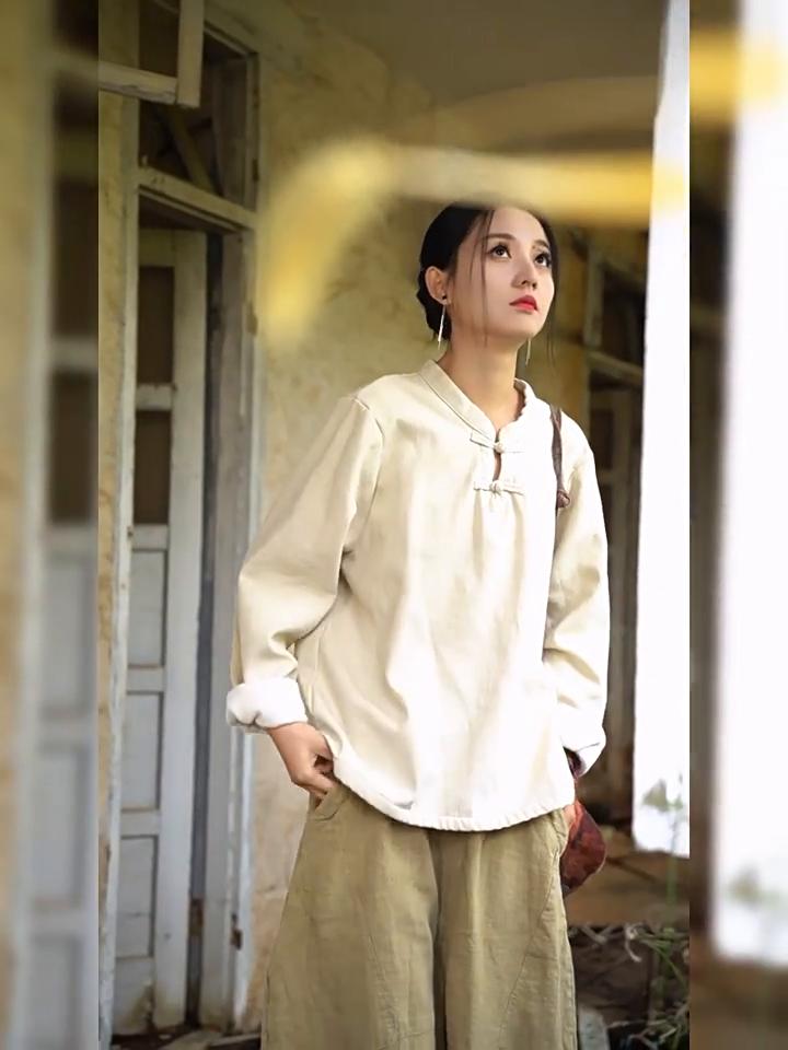 Johnature Женские флисовые рубашки в китайском стиле, однотонные теплые топы, блузки с длинным рукавом, зимняя винтажная рубашка на пуговицах