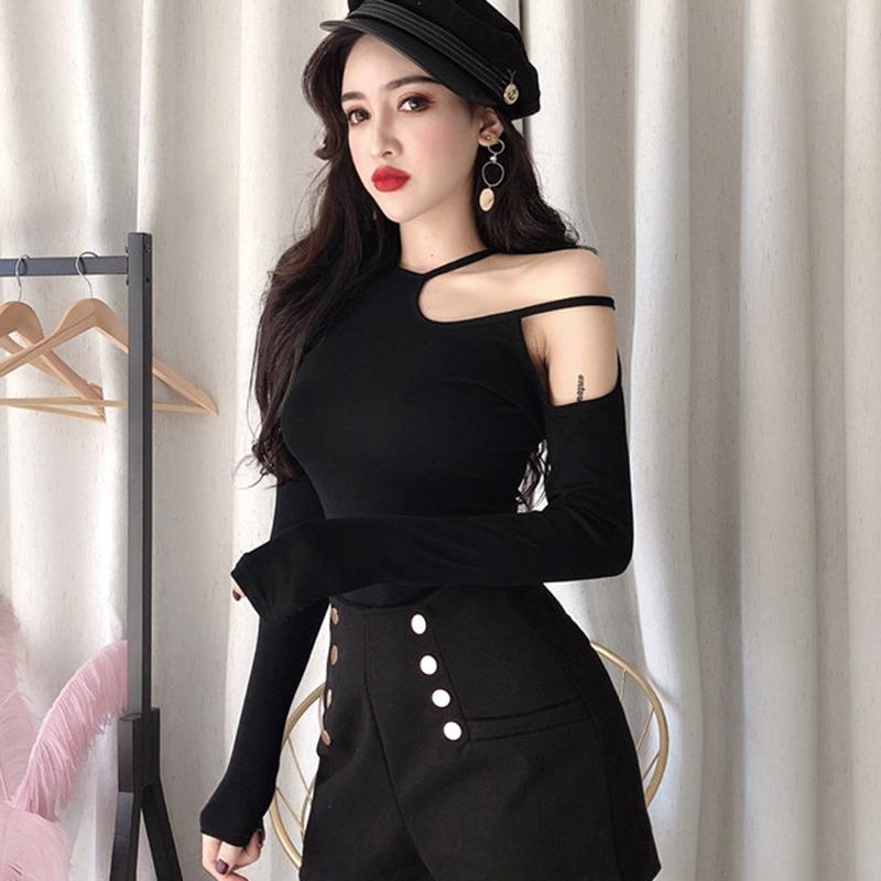 Женская футболка с асимметричным воротником и открытыми плечами, длинными рукавами — купить товар онлайн с бесплатной доставкой до всему миру!