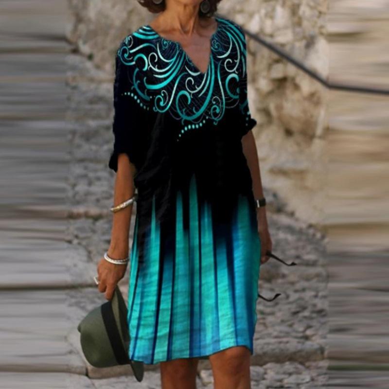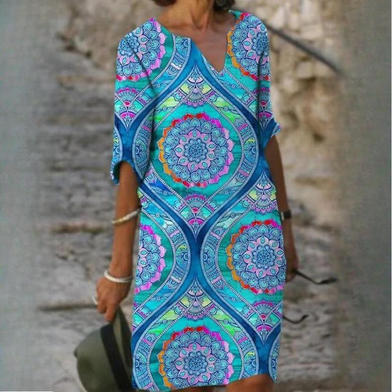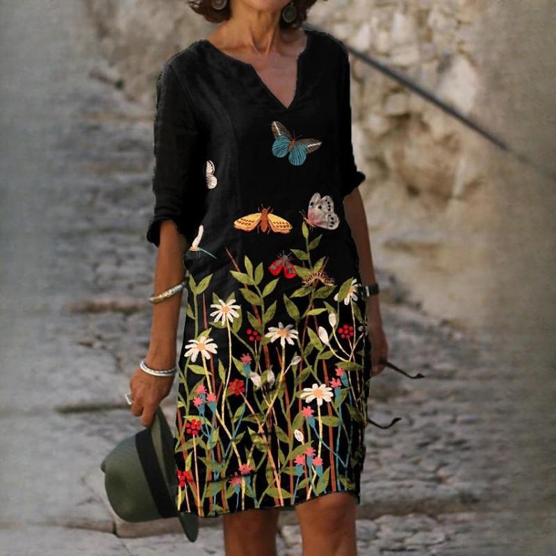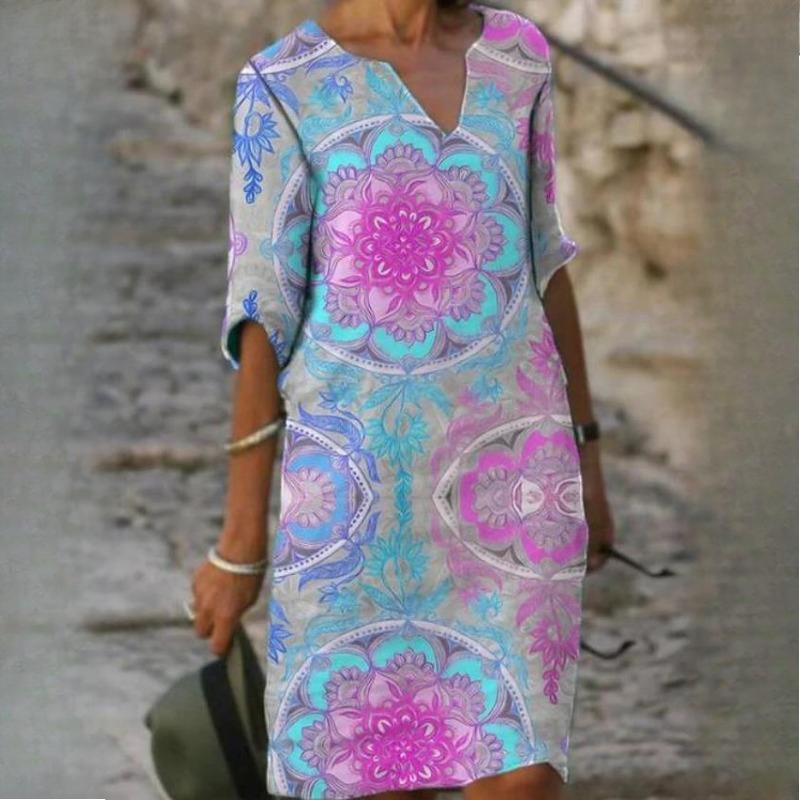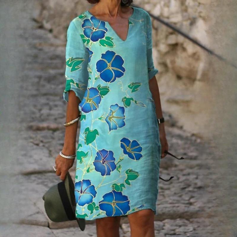 QICED Летние напечатанные свободные бамбуковые волокна пенька измельченный цветок V-образный вырез рукав пять точек женские винтажные литературные платья