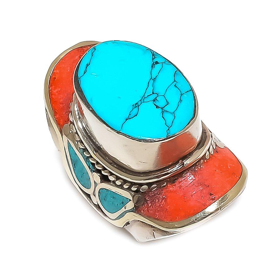 Кольцо ручной работы из натуральной тибетской бирюзы и кораллового камня, размер 8,5, p6U23