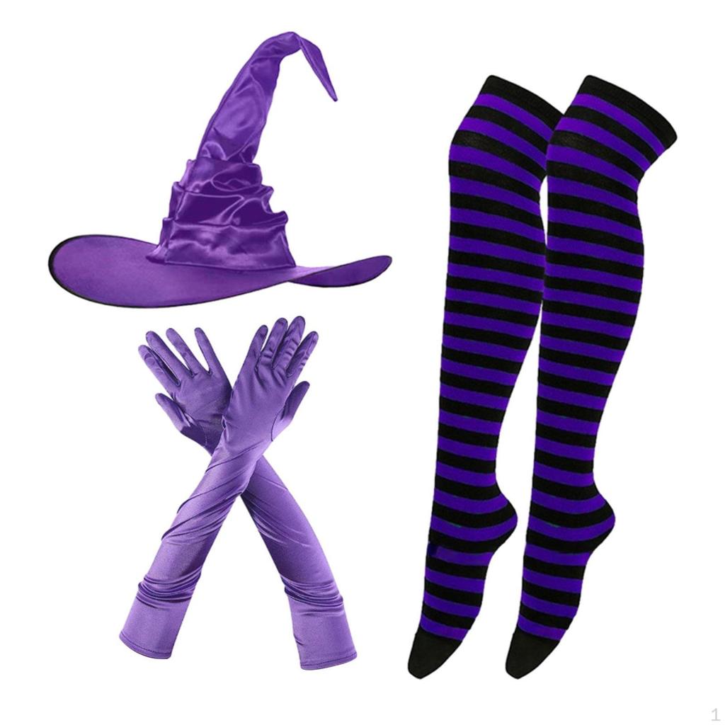 - 【Высококачественный комплект костюмов ведьмы】: Шляпа волшебника, перчатки и чулки изготовлены из высококачественных тканей, мягких, легких, прочных и не рвутся.. Размер подходит большинству женщин.