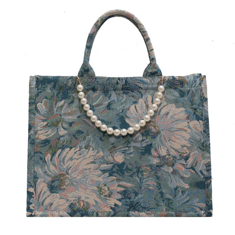 Осенняя женская холщовая сумка-тоут с жемчужными бусинами через плечо