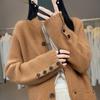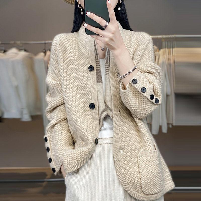 Осенне-зимний свободный универсальный кардиган с воротником-стойкой из чистого кашемира для женской верхней одежды, свитер, шерстяная вязаная куртка больших размеров