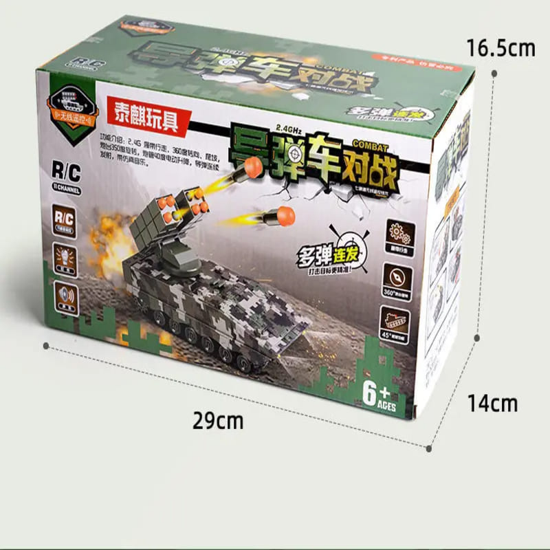 «Пробудите воображение вашего ребенка и испытайте острые ощущения от военных приключений с этим боевым танком с дистанционным управлением 2.4G, оснащенным пусковой установкой ракет военного образца и электронными звуковыми и световыми эффектами.. Эта высокотехнологичная игрушка тщательно разработана для юных любителей военного дела и предлагает захватывающий опыт боя с реалистичными функциями выброса пуль.