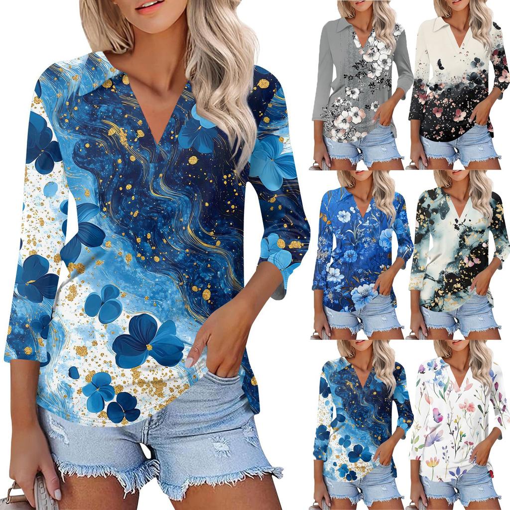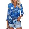 Женская мода повседневная рубашка с лацканами и рукавом 3/4 с принтом, женские топы с V-образным вырезом