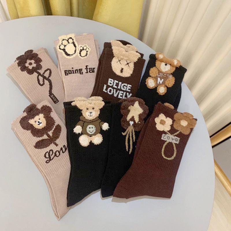 Женские модные носки средней длины с плюшевым медведем и цветком, осень/зима - Кофейный/черный — купить товар онлайн с бесплатной доставкой по всему миру!