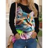 Женские футболки с принтом Cat 3D, желтые, красные, синие, с длинным рукавом, повседневные, выходные, модные, забавные, с круглым вырезом, стандартный крой, весна и осень
