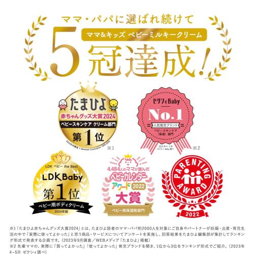 [Awards] - Tamahiyo Baby Goods Awards 2023 * 1st Place, Skin Care Category, Cream * The Tamahiyo Baby Goods Awards are the results of a ranking published in the March 2023 issues of Tamago Club and Hiyoko Club. Survey Method: Online survey. Participants: Approximat.. 2,000 Tamahiyo readers nationwide with children aged 0 months to 18 months. ・Popular childcare brand*1 No. 1 in the baby skincare category. *1 Survey conducted by Zexy Baby in July 2022. ・Baby Calendar Awards 2022 Grand Prize in the baby moisturizer category. ・Parenting Awards 2022*2 Grand Prize in the goods/services category. *2 The Parenting Awards are an awards program primarily run by parenting magazines, recognizing trends (people, products, and events) related to parenting and providing reliable, timely information.