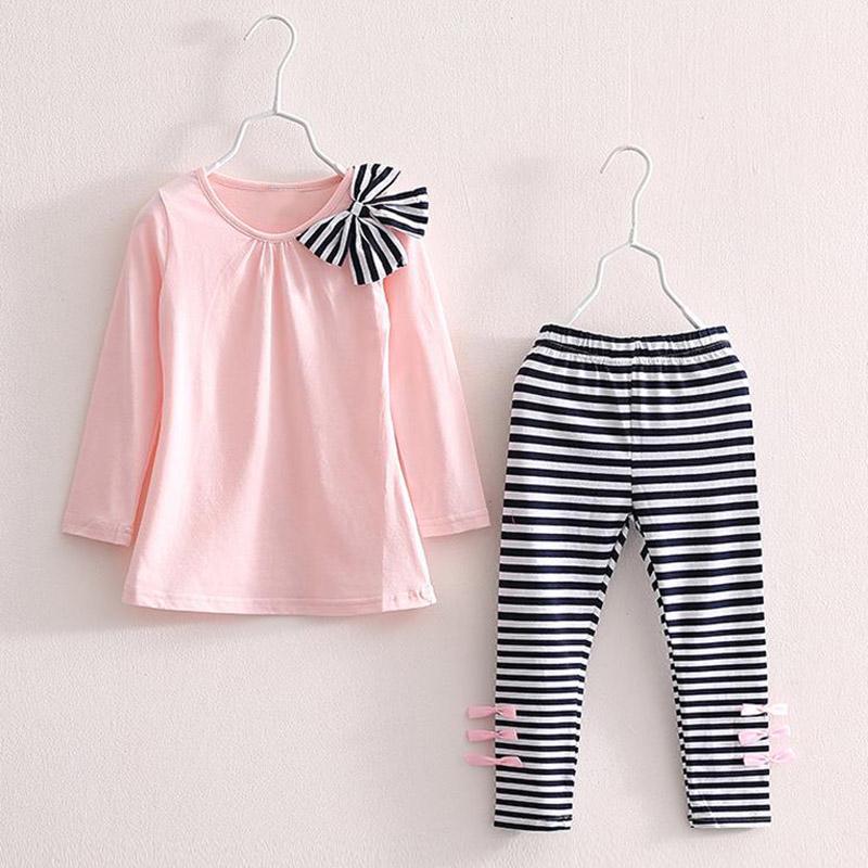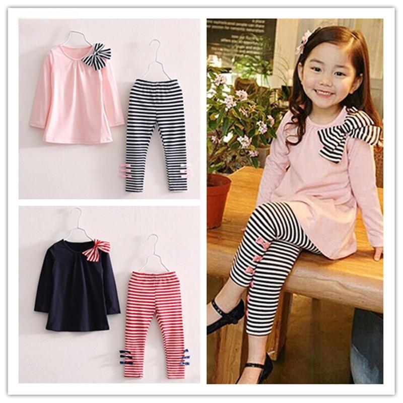 Детская спортивная одежда для девочек, комплект из осенне-зимнего топа с бантом и полосатыми штанами, детская одежда для девочек 3-7 лет