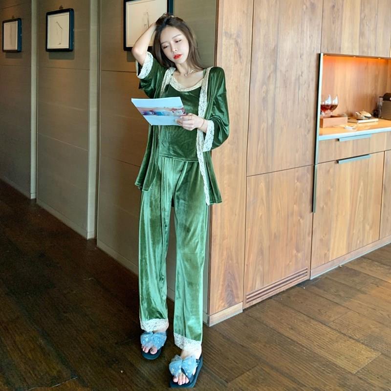 Осень-зима новый женский бархатный пижамный комплект из 3 предметов, одежда для сна, повседневная женская велюровая кружевная ночная рубашка, пижамный костюм, свободная домашняя одежда