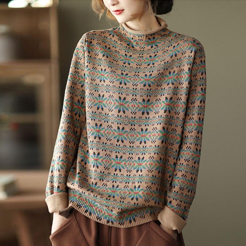 Женский винтажный свободный повседневный свитер с цветочным принтом, водолазка с длинными рукавами, зимний пуловер в китайском стиле