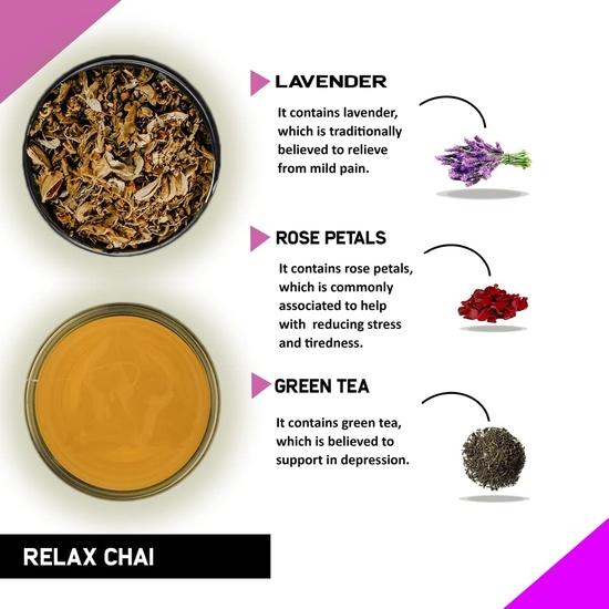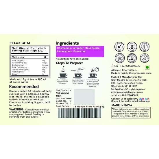 100% чай для снятия стресса - наряду с ромашкой, розой и цветами лаванды, чай Teacurry Relax содержит лемонграсс и зеленый чай.. Собранные вручную на чайных плантациях в Ассаме листья зеленого чая способствуют сжиганию жира и улучшают обмен веществ.. Лемонграсс в форме Cymbopogon Citratus выращивается в Керале и затем добавляется в зеленый чай Teacurry Relax.. Лемонграсс также помогает облегчить боль, снизить температуру и регулировать уровень холестерина в крови.