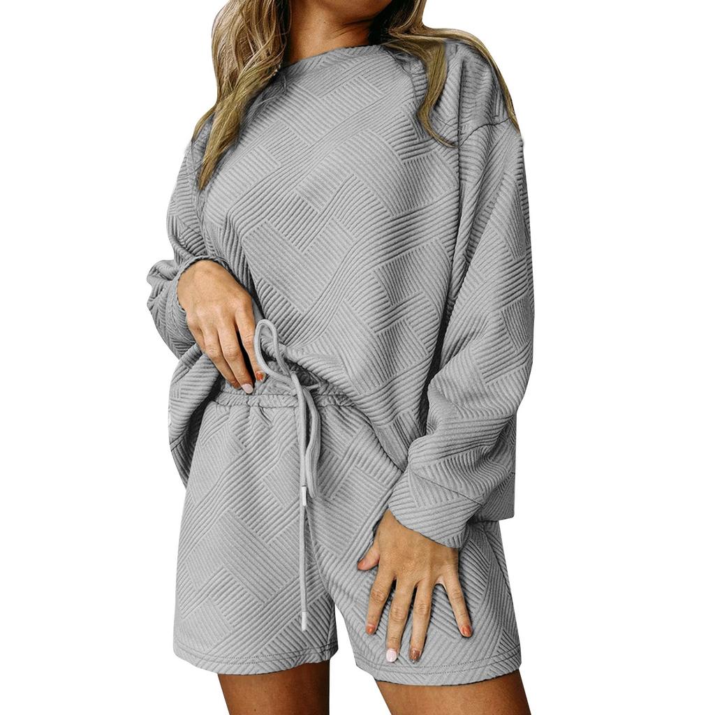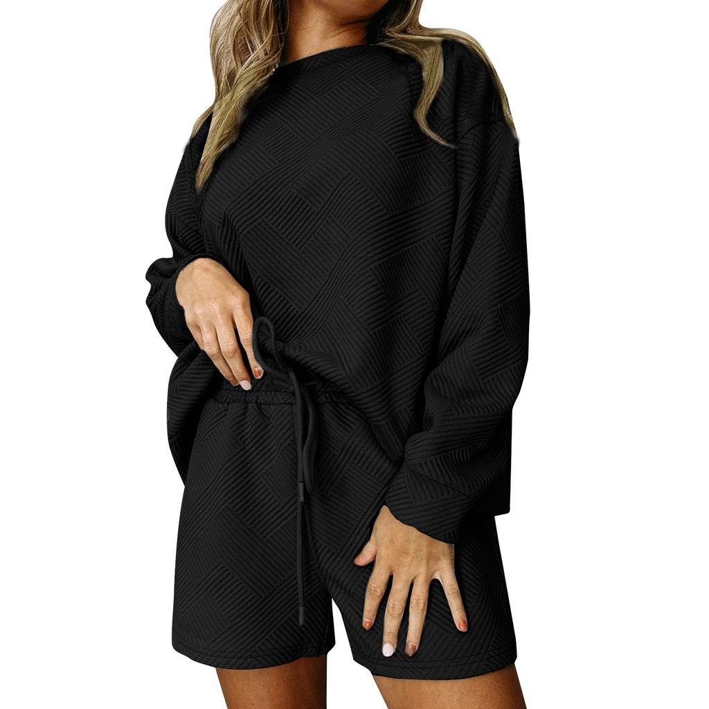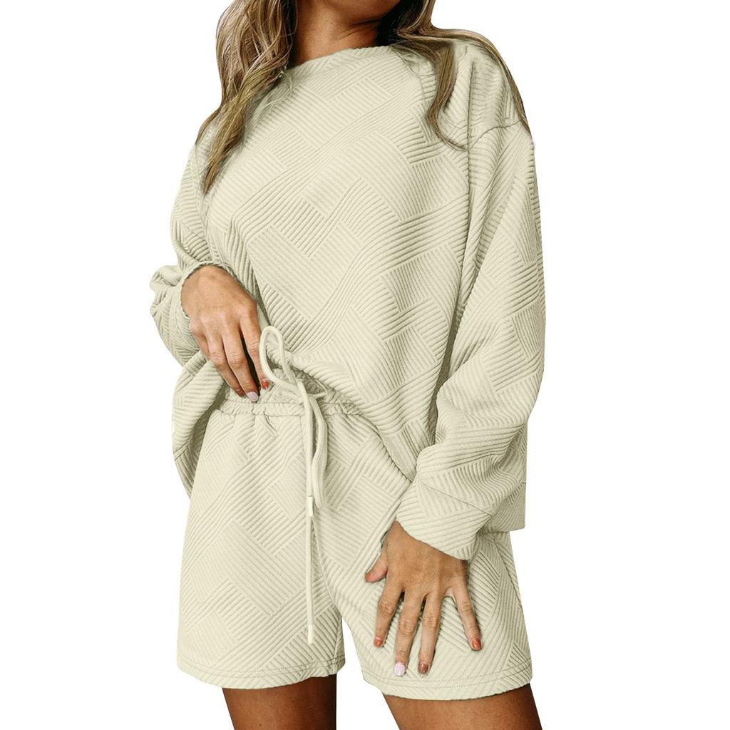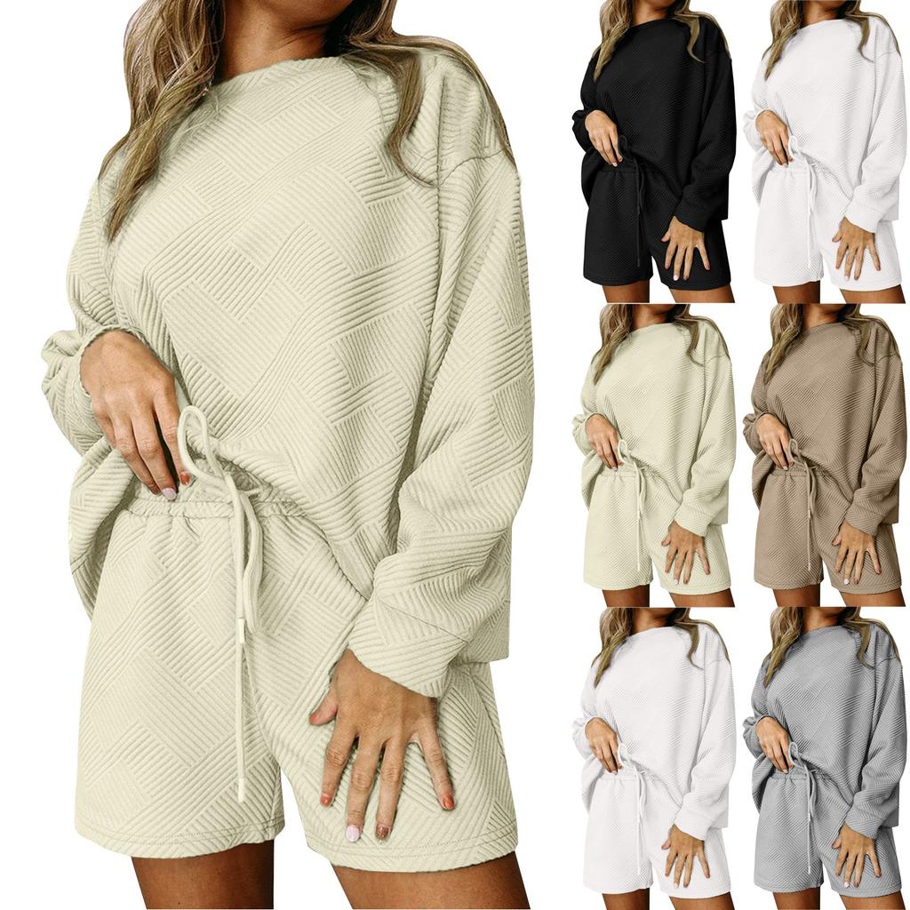 Женская мода Свободный пуловер с круглым вырезом Повседневные шорты с длинным рукавом Модный костюм