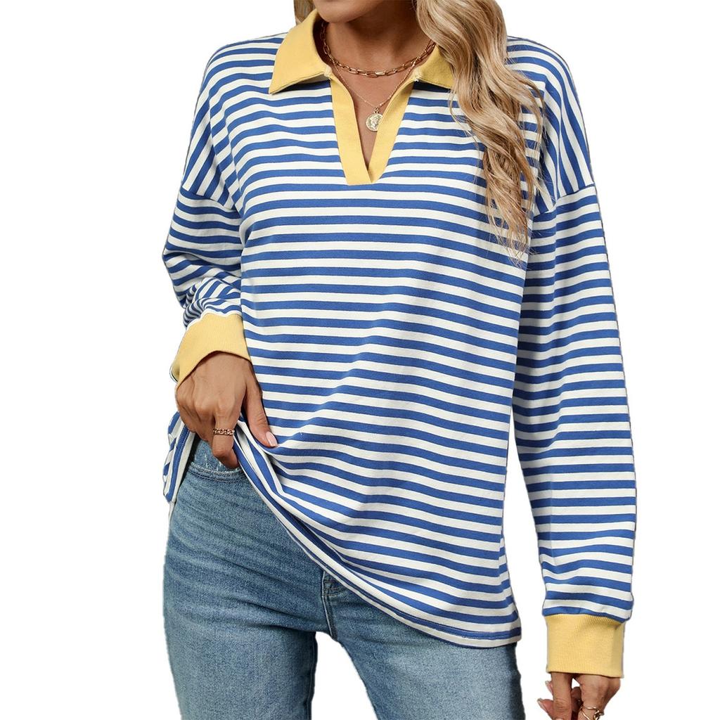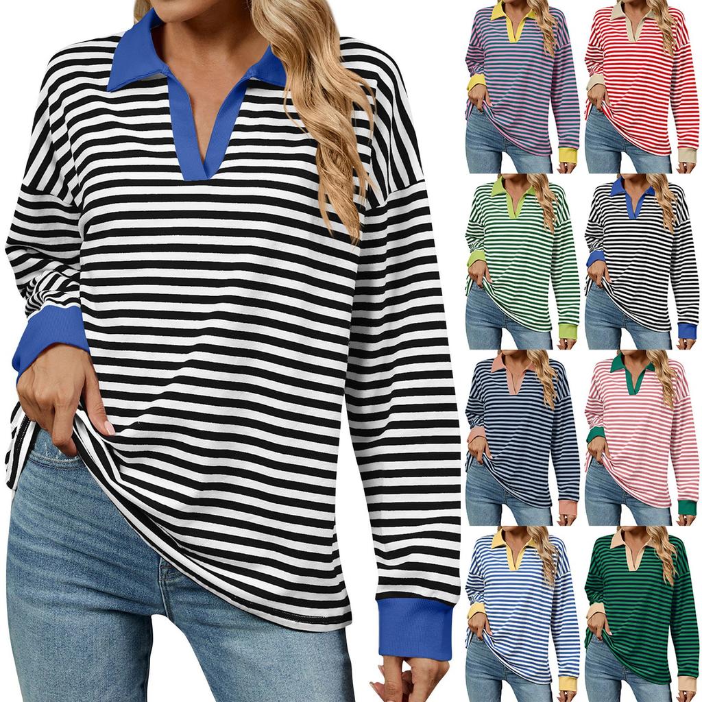 Женская модная полосатая футболка с V-образным вырезом и длинным рукавом, повседневная футболка, топ