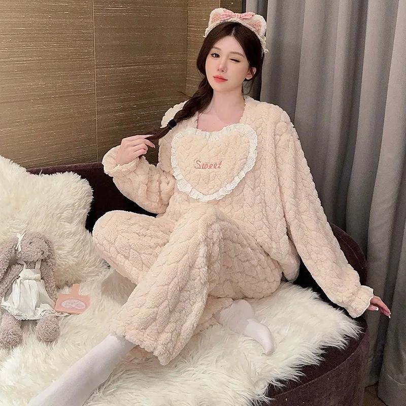 Женский зимний теплый пижамный комплект из кораллового флиса, топ с длинными рукавами и штаны, пижамный комплект из мягкой фланели, домашняя одежда, куртка