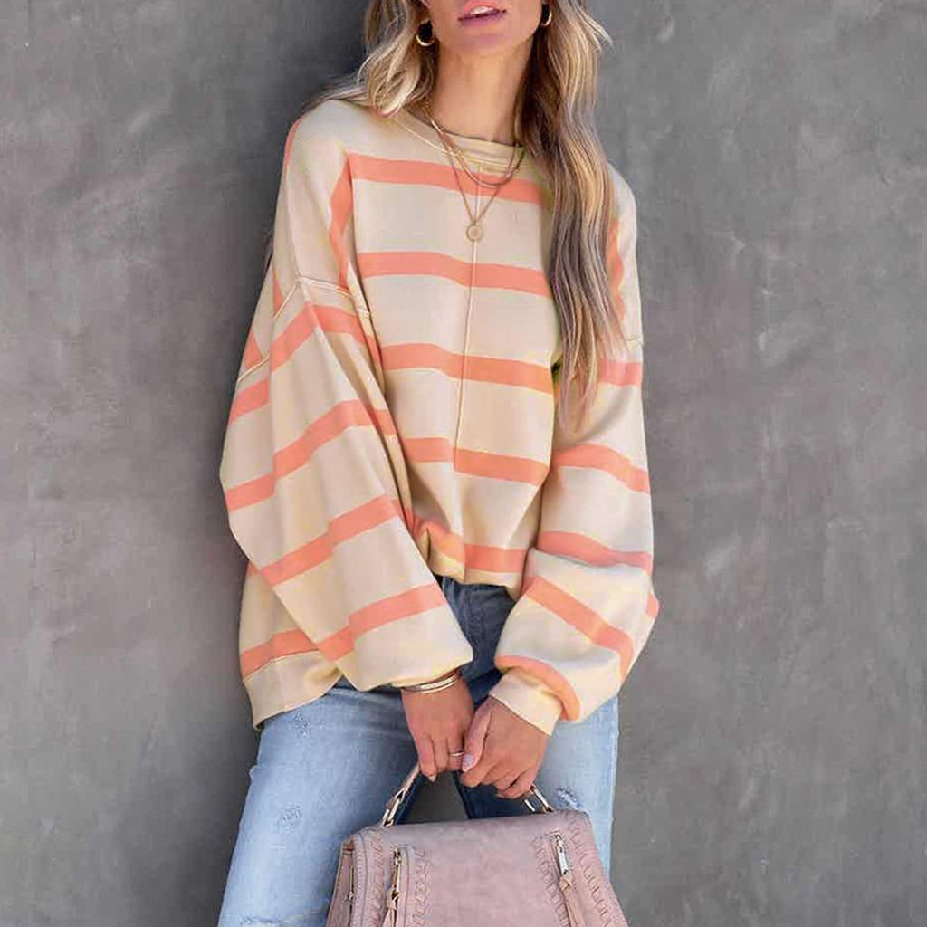 Женская модная повседневная футболка с длинным рукавом и круглым вырезом, полосатая футболка