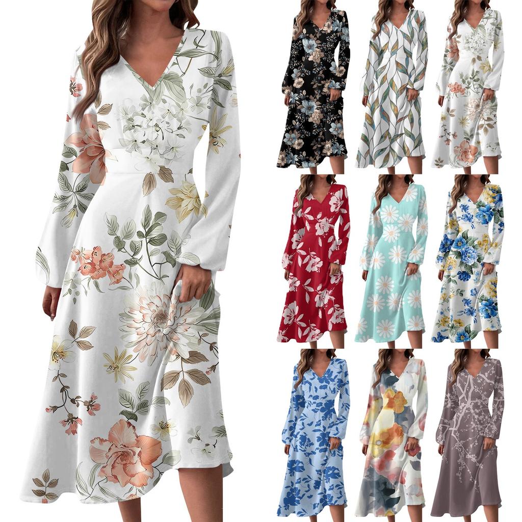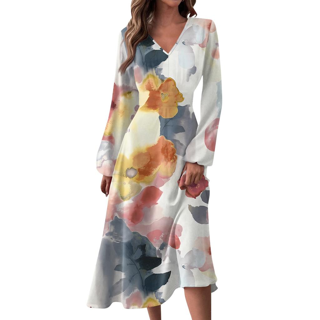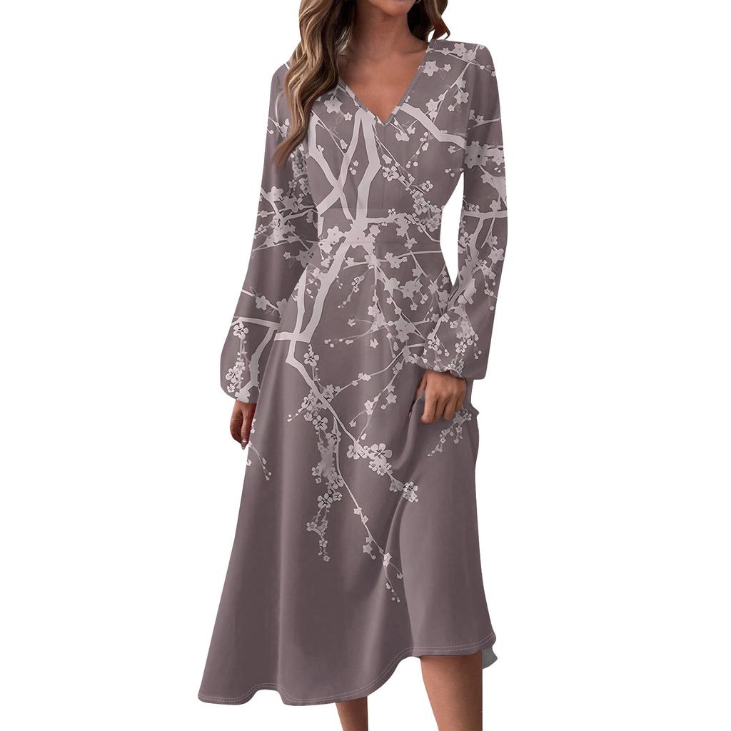 Женское осенне-зимнее повседневное модное длинное платье с v-образным вырезом и длинным рукавом с принтом