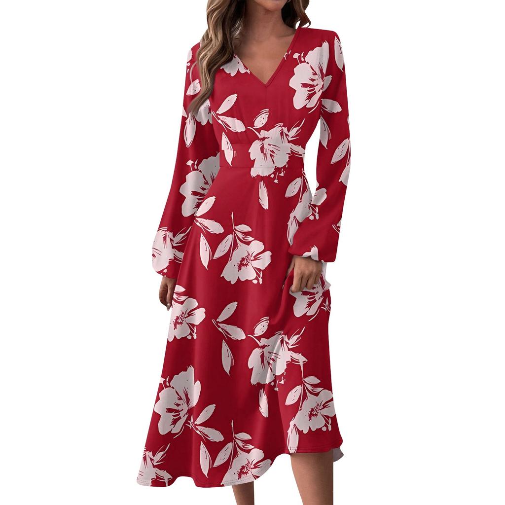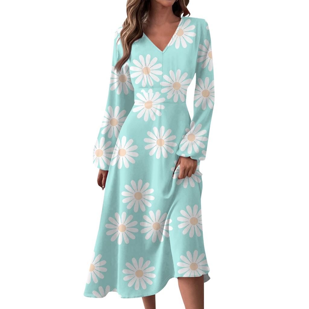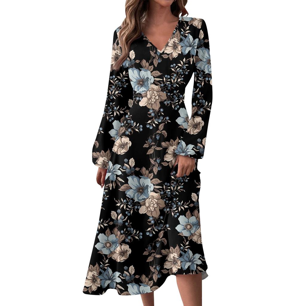 Женское осенне-зимнее повседневное модное длинное платье с v-образным вырезом и длинным рукавом с принтом