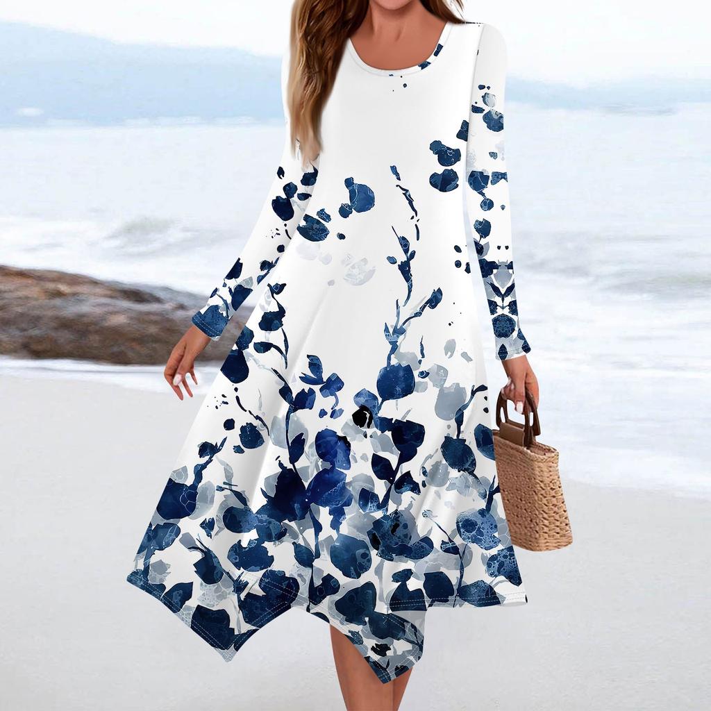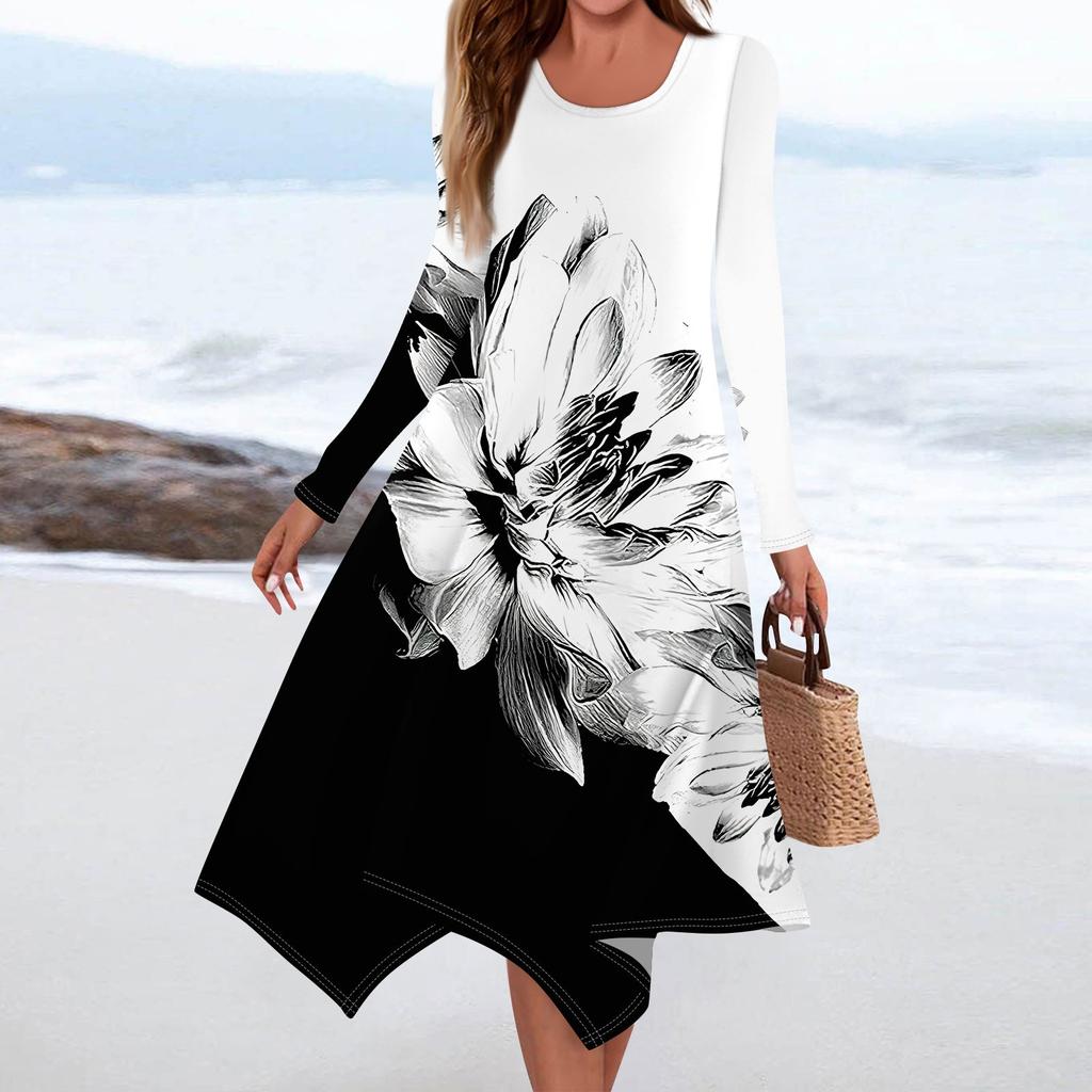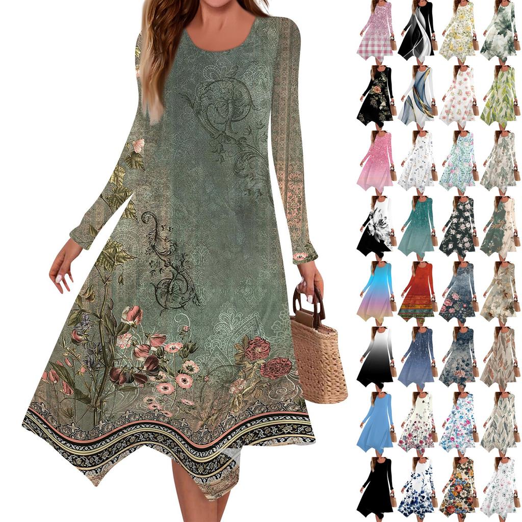 Женское повседневное модное платье миди с круглым вырезом и длинными рукавами с принтом и нерегулярным подолом