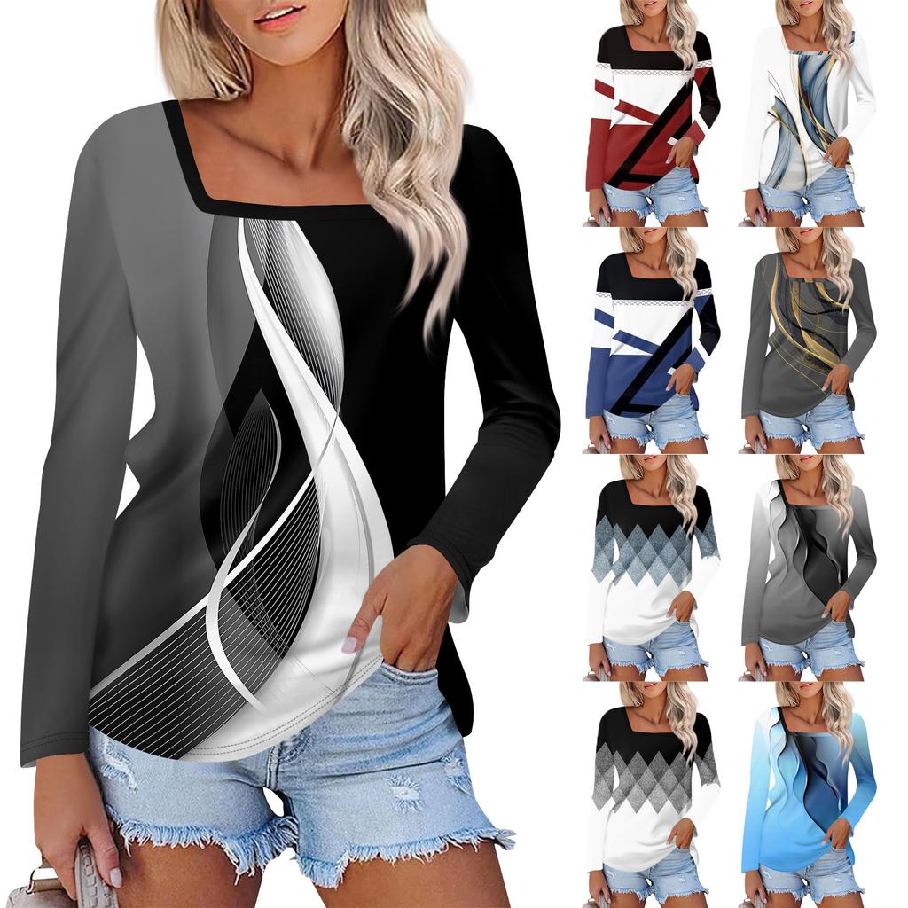 Рубашка для женщин, модная повседневная свободная футболка с квадратным вырезом и длинным рукавом с принтом, женский топ — купить товар онлайн с бесплатной доставкой до всему миру!