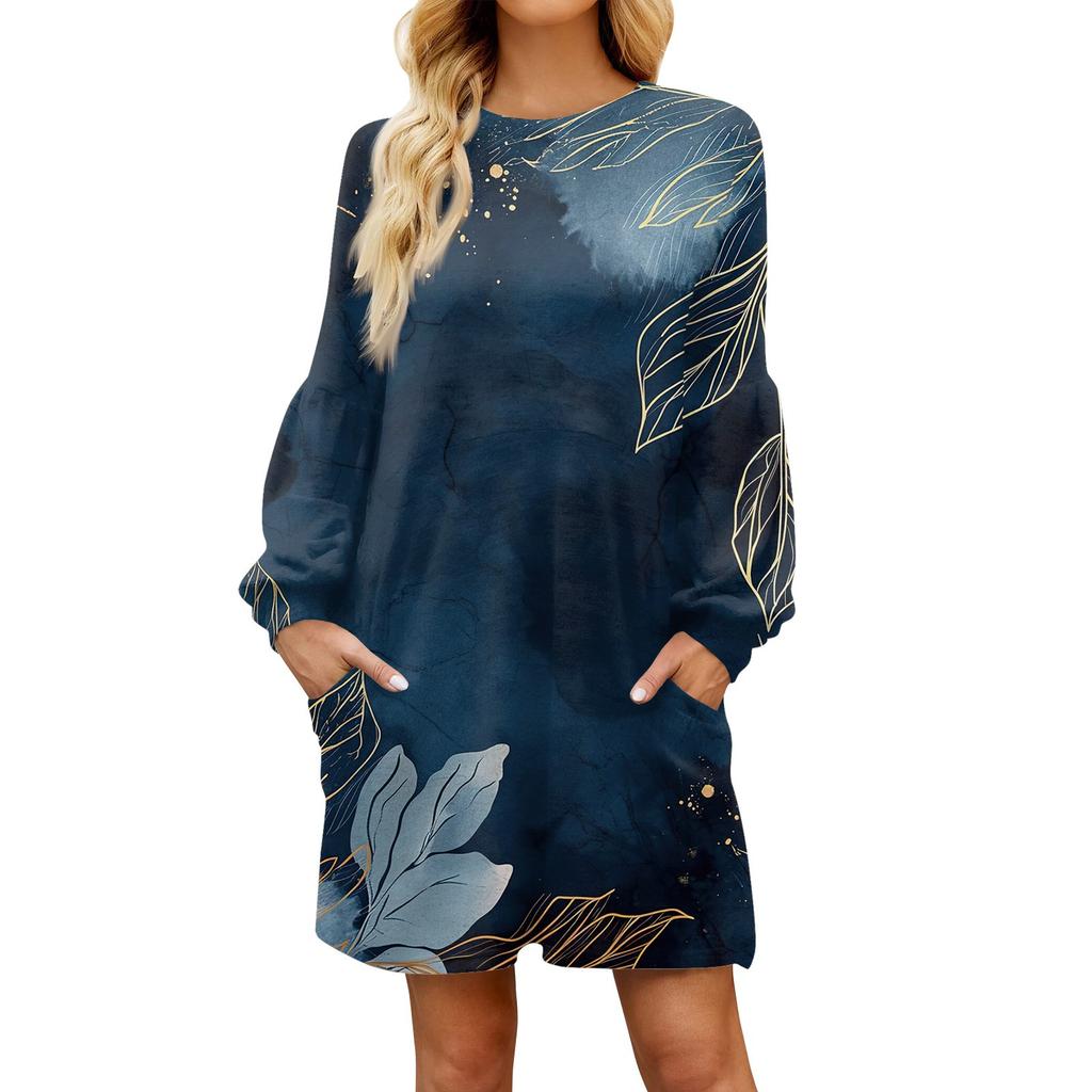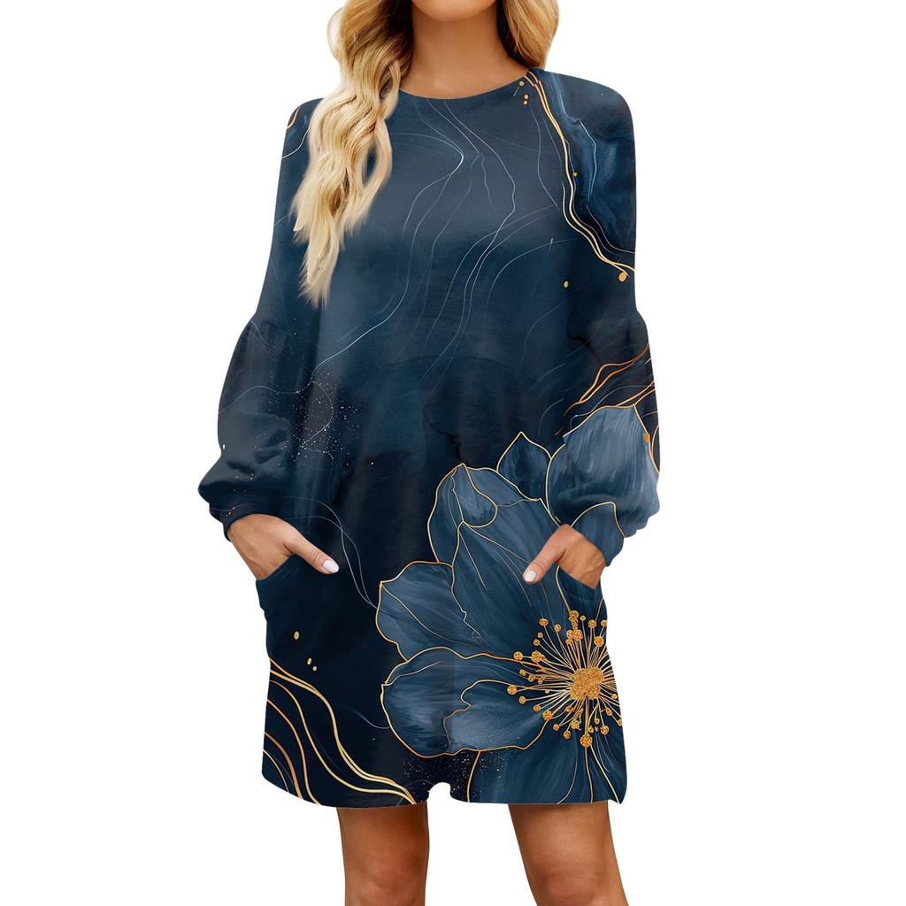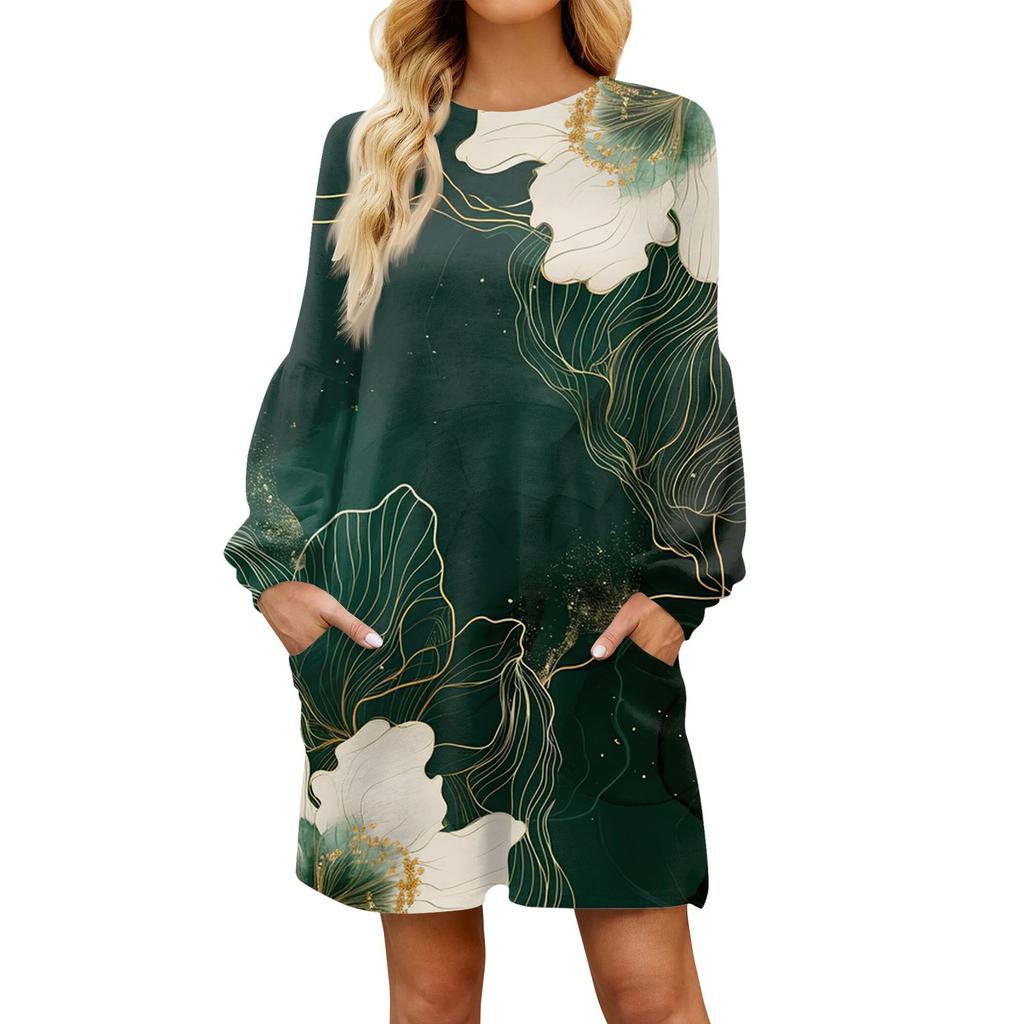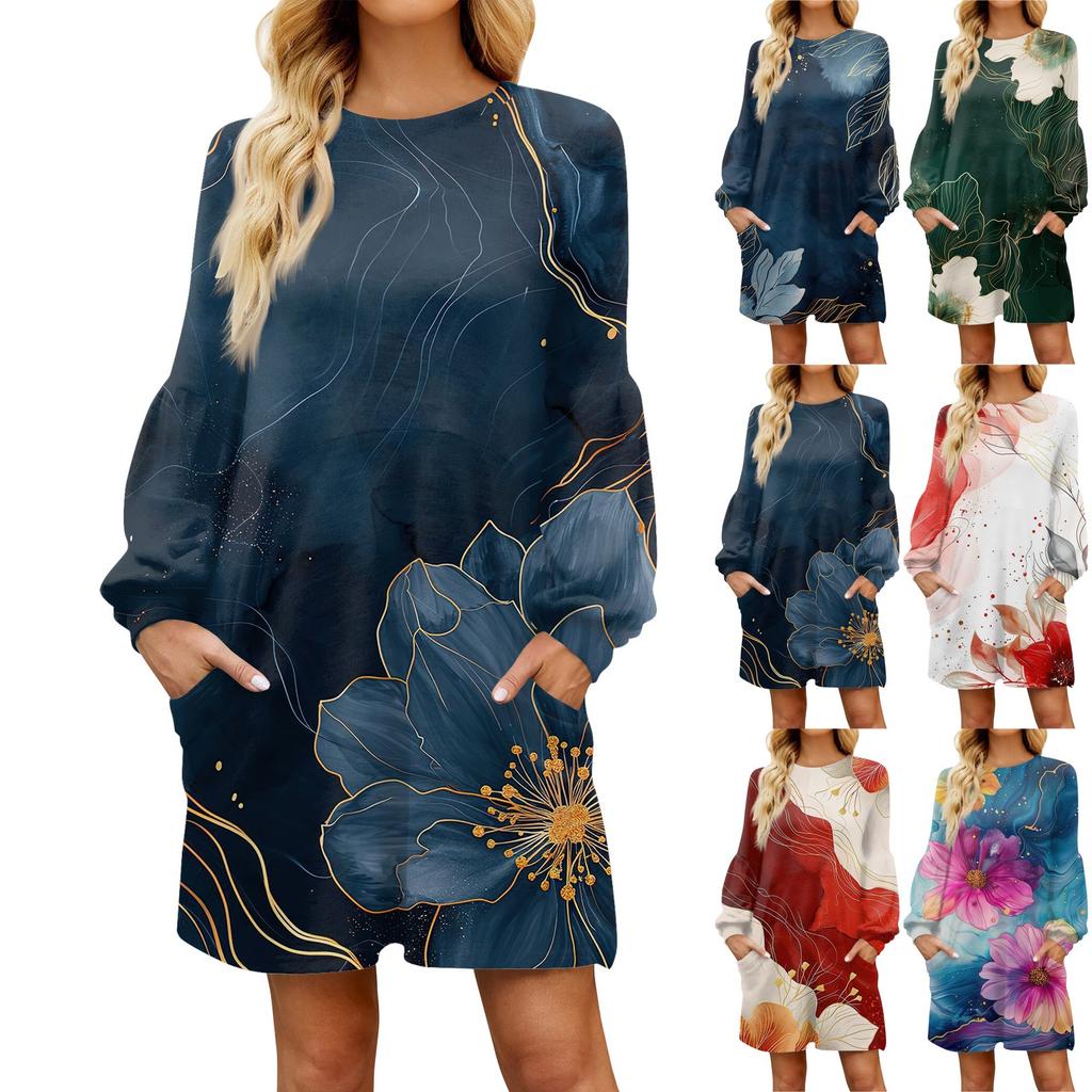 Модное женское осеннее повседневное свободное платье с цветочным принтом и длинным рукавом