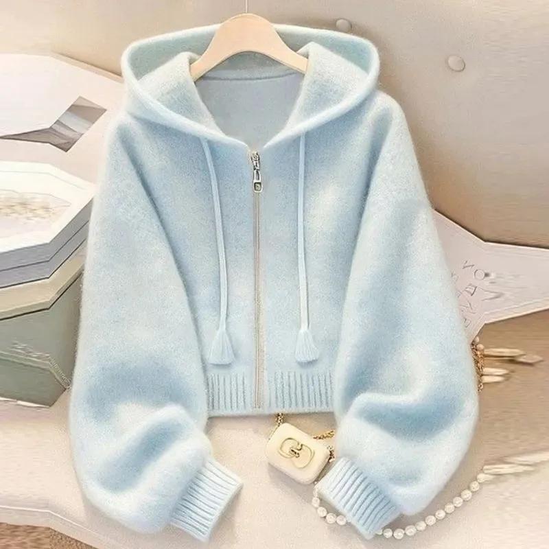 Осень-весна ленивый стиль мягкий синий кардиган свитера женщины длинный рукав элегантный вязаный жакет милый дизайн женская повседневная верхняя одежда с капюшоном топы