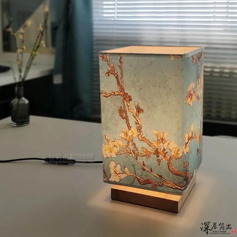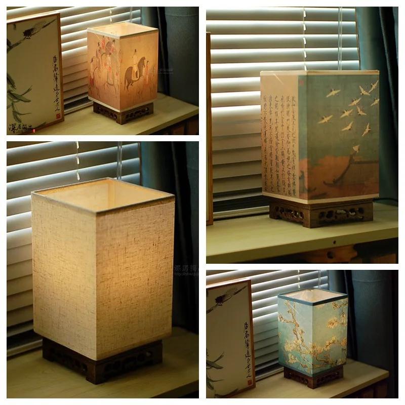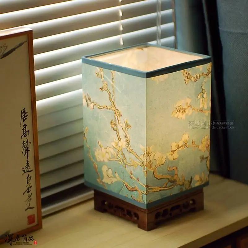 Японская квадратная настольная лампа из цельного дерева, новая китайская ретро-дзен-ночник для спальни, ночник с теплым светом и регулируемой яркостью светодиода