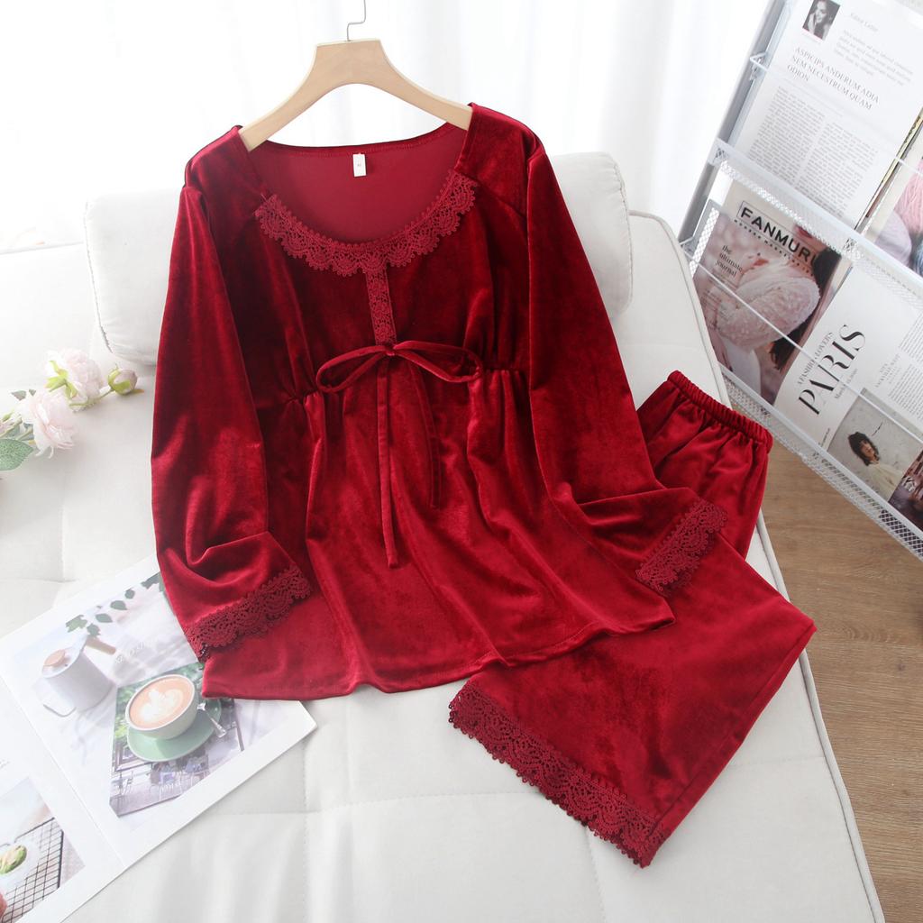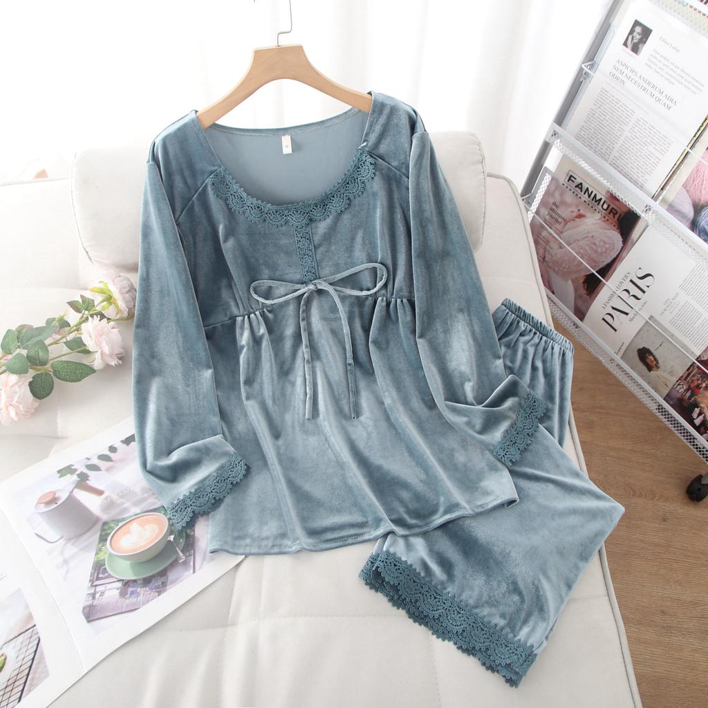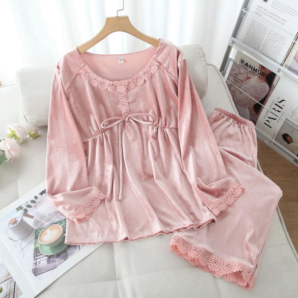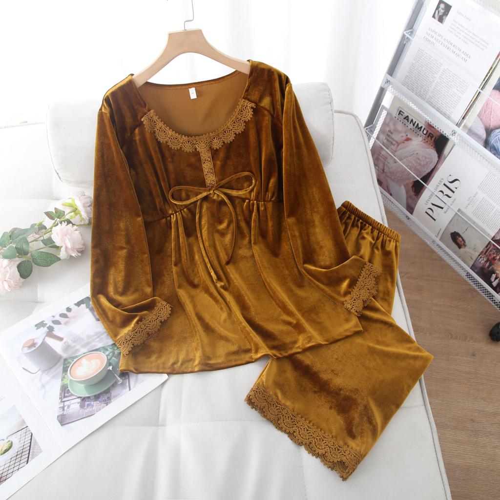 Золотая бархатная пижама из двух частей для женщин, осень и зима, однотонная кружевная сексуальная теплая домашняя одежда, пижама в корейском стиле