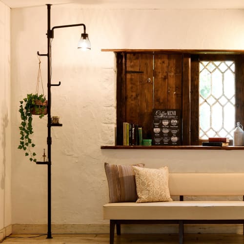 Напольный светильник Yamazen, вешалка для одежды, натяжение, подставка для кашпо, ширина 56-64,5 x глубина 30 x высота 190-260 см, в комплекте 2 подноса и 2 крючка, основание E26, подсветка b