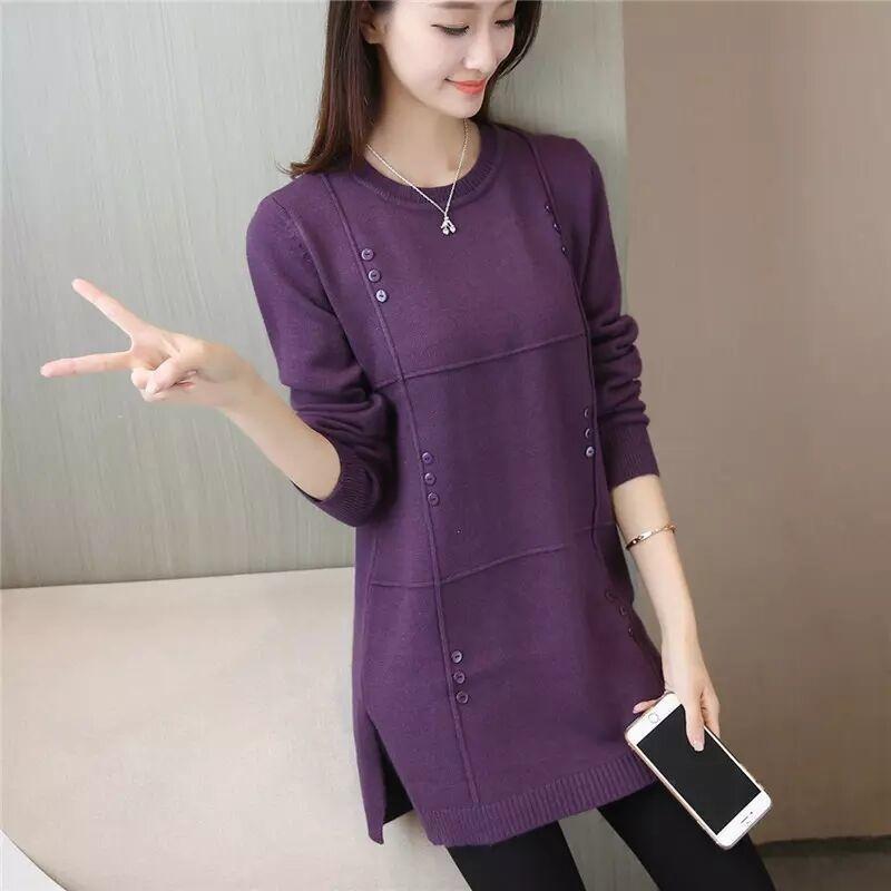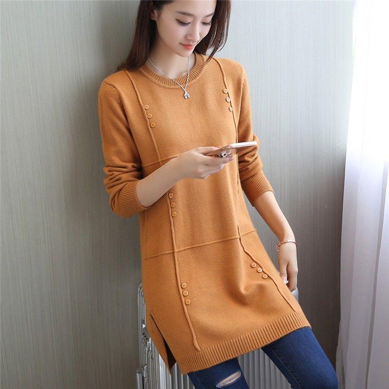 Осень Зима Женский свитер Однотонный пуловер Трикотаж Свитер О-образный вырез Длинный рукав Средней длины Свитер Женская одежда