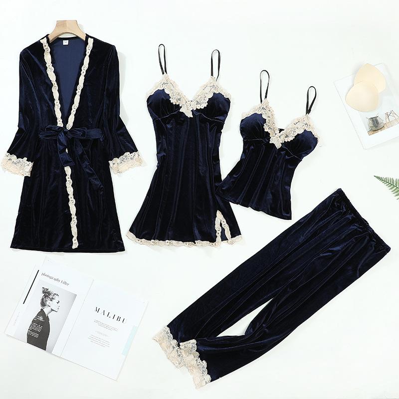 Бархатная женская пижама, комплект из четырех предметов, сексуальный халат с кружевной отделкой, брючные костюмы, осенне-зимняя велюровая домашняя одежда, одежда для отдыха