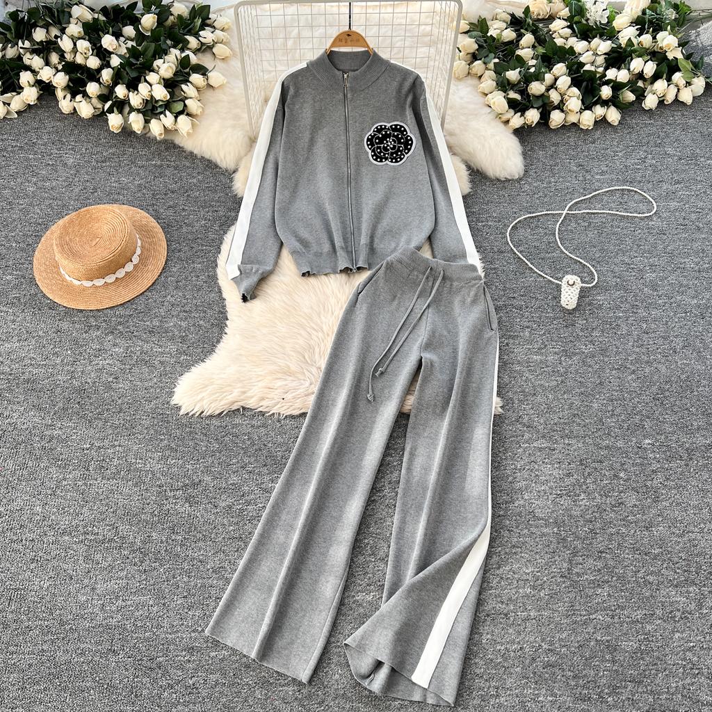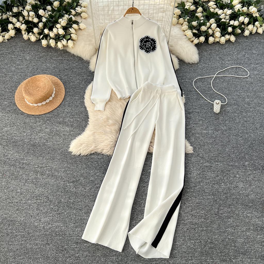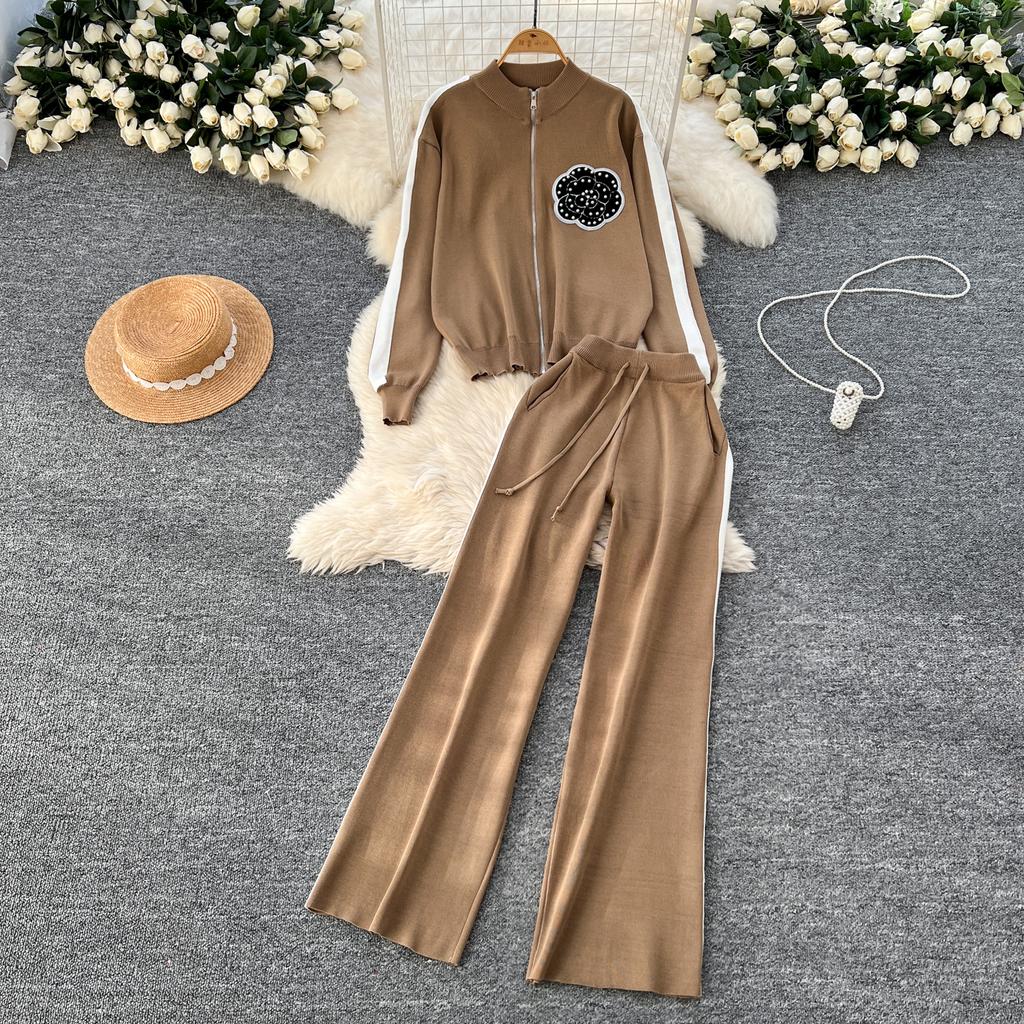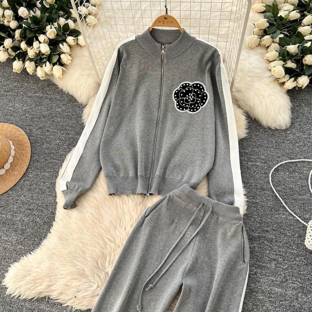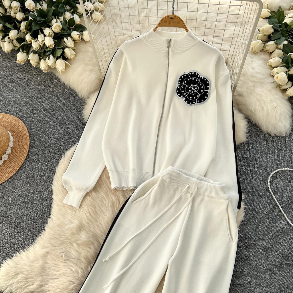 Осенне-зимний вышитый цветочный вязаный свитер, брюки, комплект из двух предметов, женская куртка на молнии, пальто и брюки длиной до щиколотки, спортивный костюм