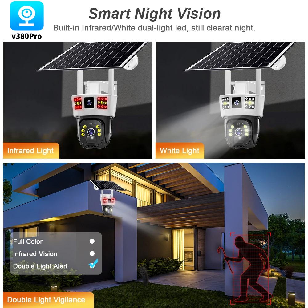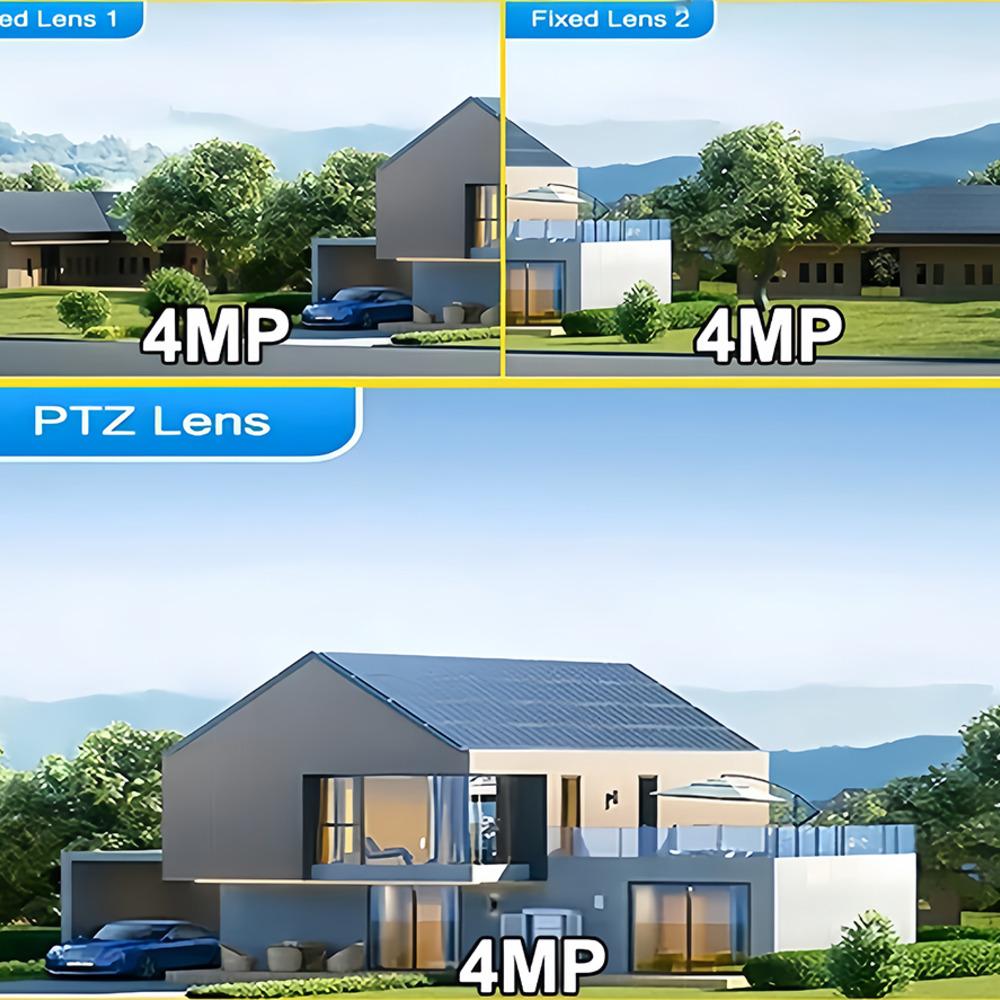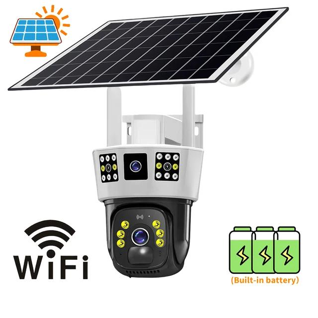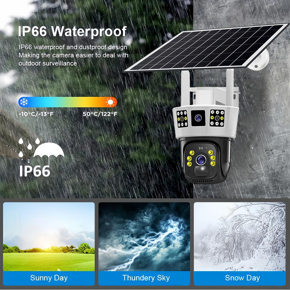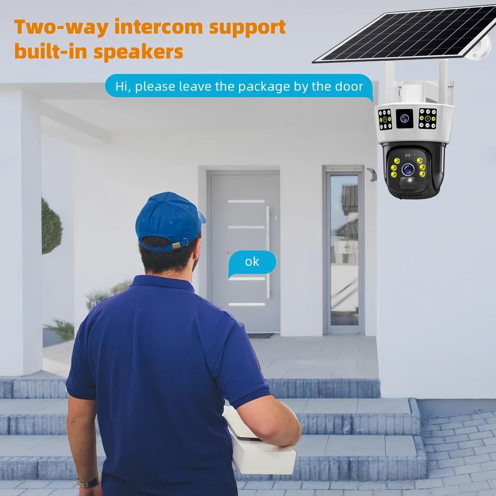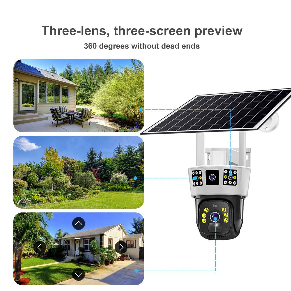 Камера видеонаблюдения на солнечной батарее не нуждается в кабелях и источнике питания. Просто вставьте SIM-карту версии 4G или подключитесь к Wi-Fi версии 2.4G, чтобы использовать его со встроенным аккумулятором и непрерывной солнечной зарядкой в течение 365 дней непрерывного использования.. Простота установки и использования. Избавьтесь от ненужных и утомительных шагов, сэкономьте время и труд. Традиционные однообъективные камеры не могут обеспечить 360-градусное наблюдение, поэтому необходимо установить не менее двух камер.. Мониторинг одной камеры имеет слабые места, диапазон мониторинга не является исчерпывающим. Текущая модернизированная версия трехэкранной камеры эквивалентна использованию двух камер, нет мертвых зон, стоимость равна только стоимости устройства, экономия времени и трудаДвусторонняя голосовая связь