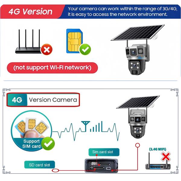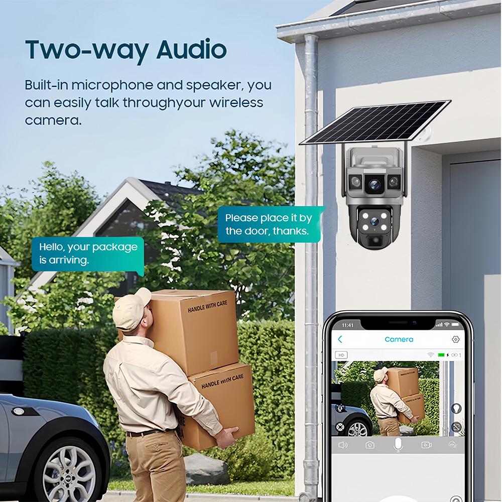 Это солнечная камера, доступная круглый год, 6K 12MP Ultra HD 3-экранное видеонаблюдение. Оснащена солнечной панелью 8 Вт, встроенным аккумулятором 8000 мАч, PTZ-управлением через приложение, поворачивается по горизонтали на 350° и по вертикали на 90°. Когда и где бы вы ни захотели, вы можете управлять этим напрямую через приложение. Сетевая версия 4G-камеры: поддерживает только местные SIM-карты 4G (несовместимо с WiFi-подключениями)6K 12MP высокое разрешение6K 12MP представляет собой определение выше 5MP ,1080P. Пропорциональное изображение высокого качества изображения с разрешением 12,0 мегапикселей. Предоставляет вам плавный и впечатляющий опыт супер HD. Одновременный просмотр трех экранов. Сетевые требования солнечной камеры3 изображения поддерживают отдельный зум, с максимальным цифровым зумом 10x.Три объектива три изображения, многоугольный многопозиционный мониторингАвтоматическое отслеживание, захват каждого моментаЧеткий двусторонний звук