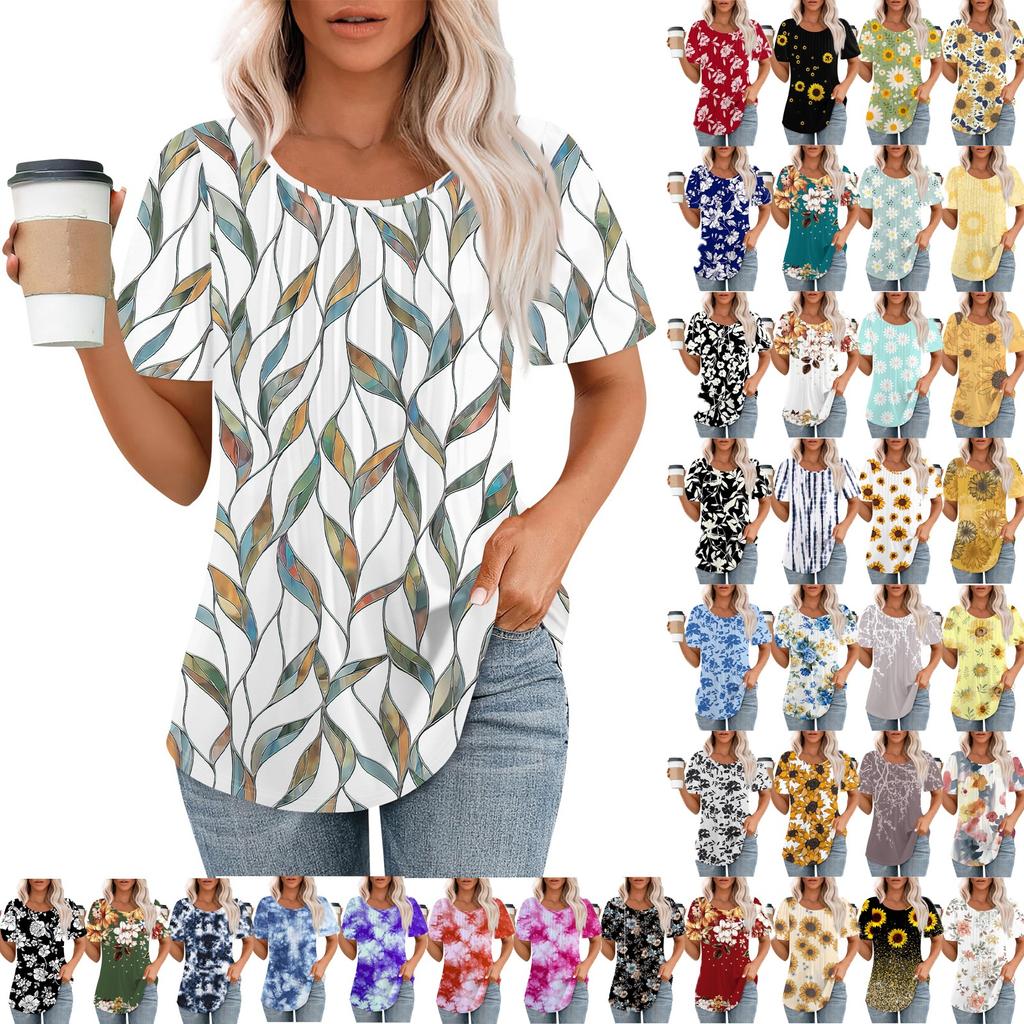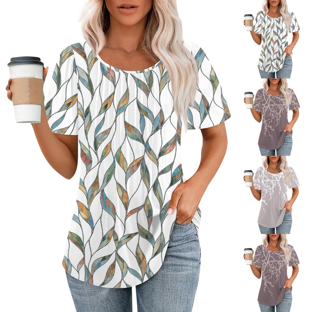 Женская летняя модная повседневная плиссированная футболка с коротким рукавом и круглым вырезом с принтом Топ