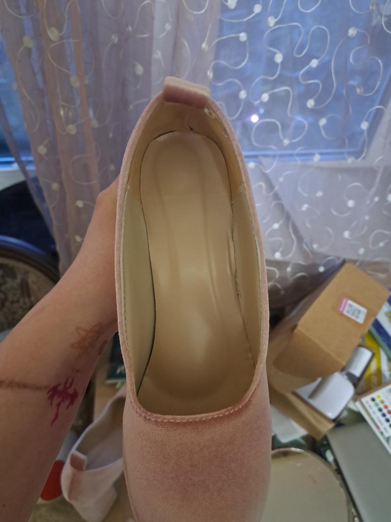 немного маломерят и не подходят под анатомию стопы, вся тяжесть идёт на начало пальцев ног, корпус мягкий, сами по себе туфли немного не аккуратно пошиты, ну и цвет чуть темнее чем на картинке, каблук ≈11 см