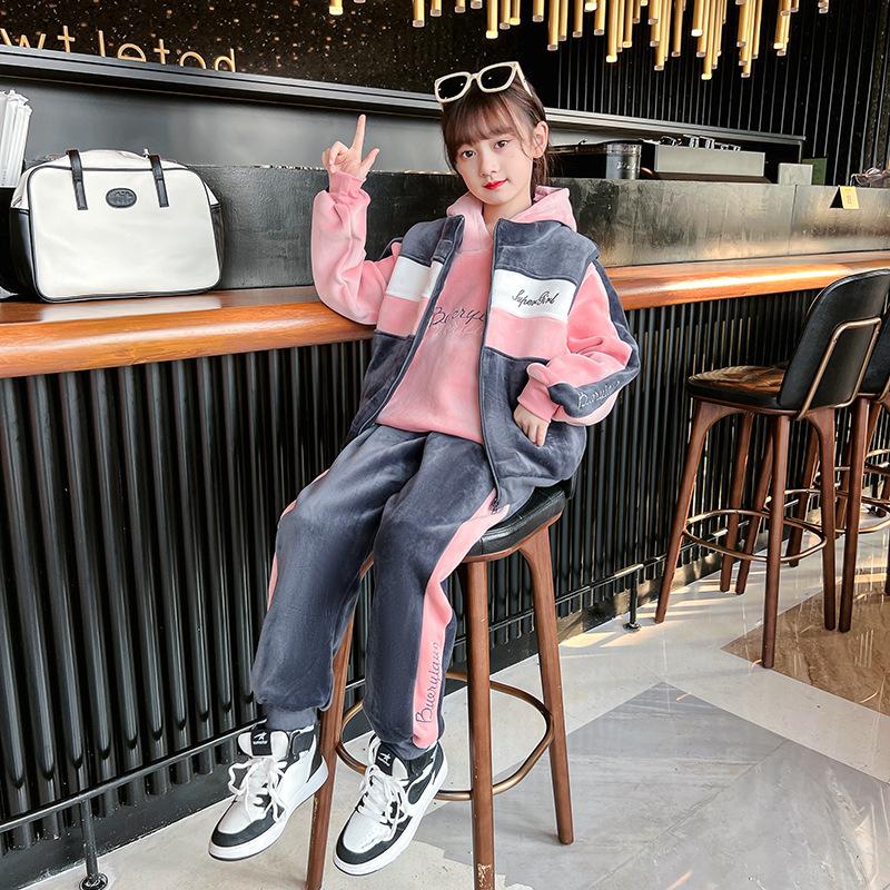 Зимняя толстовка для девочек, брюки, осенне-зимний детский утолщенный костюм, жилет, костюм-тройка