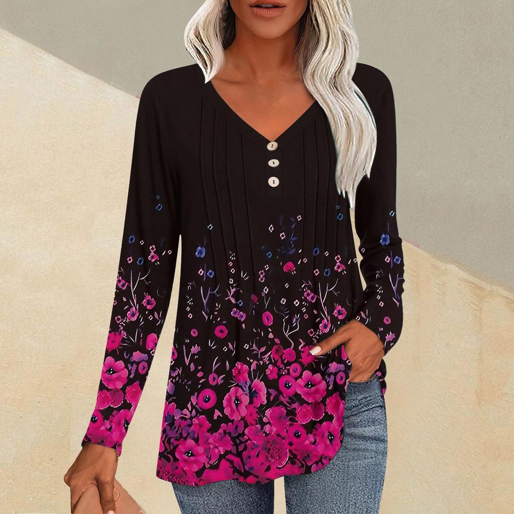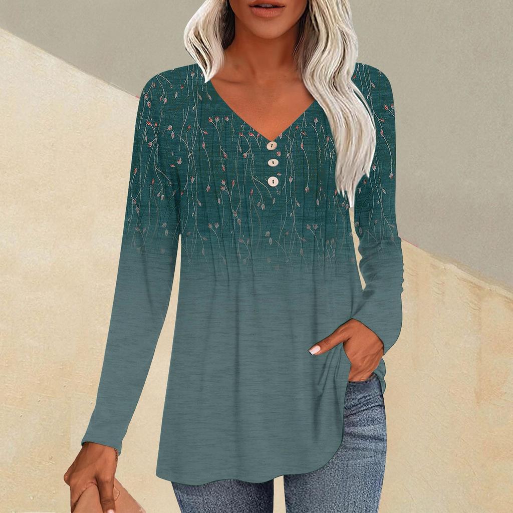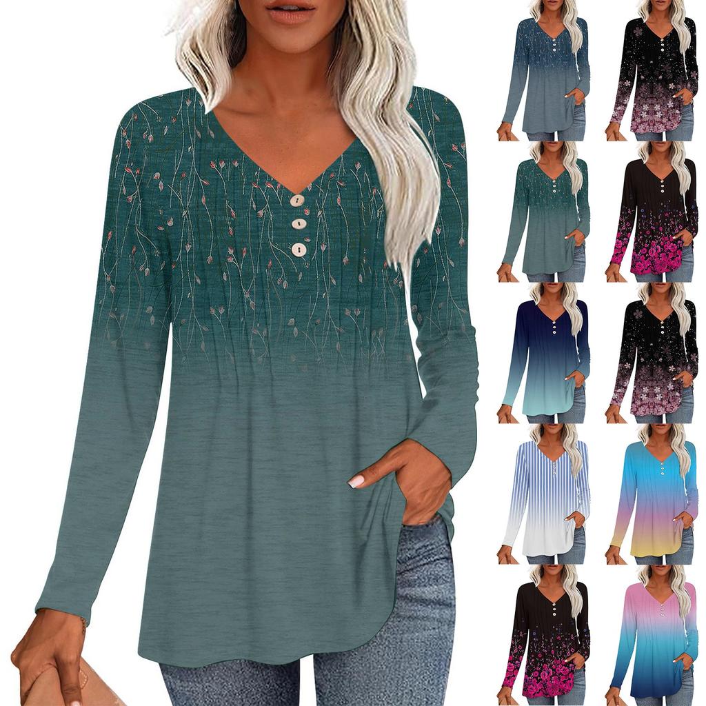 Женская модная повседневная плиссированная футболка с V-образным вырезом и градиентным принтом с длинным рукавом