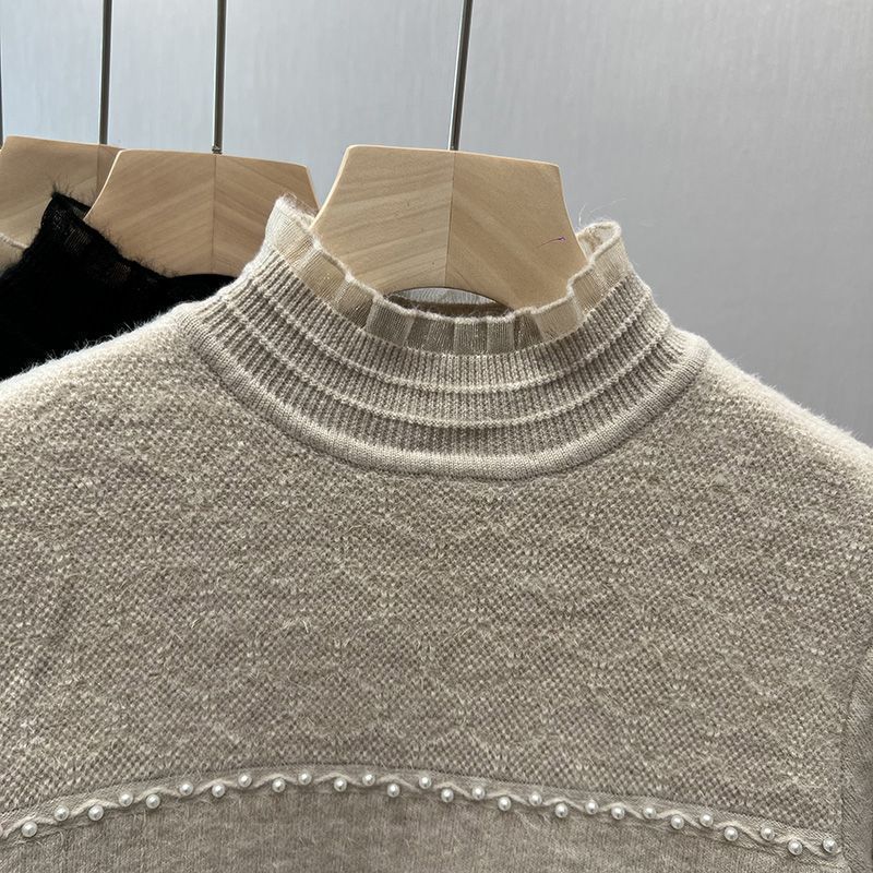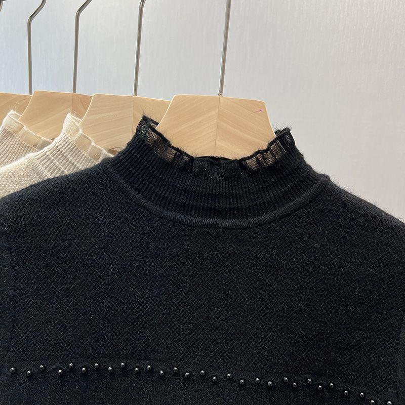 Женский теплый цельный бархатный свитер с полувысоким воротом, с утолщенной кружевной кромкой, на осенне-зимней основе