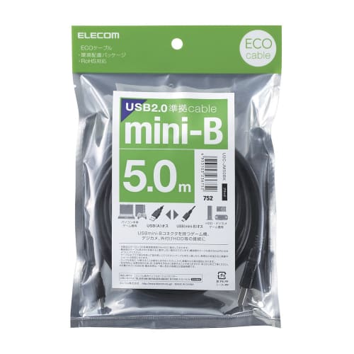 ELECOM RoHS Compliant & Environmentally Friendly Package Eco USB Cable USB2.0 A-miniB Type 5m Black U2C-JM50BK