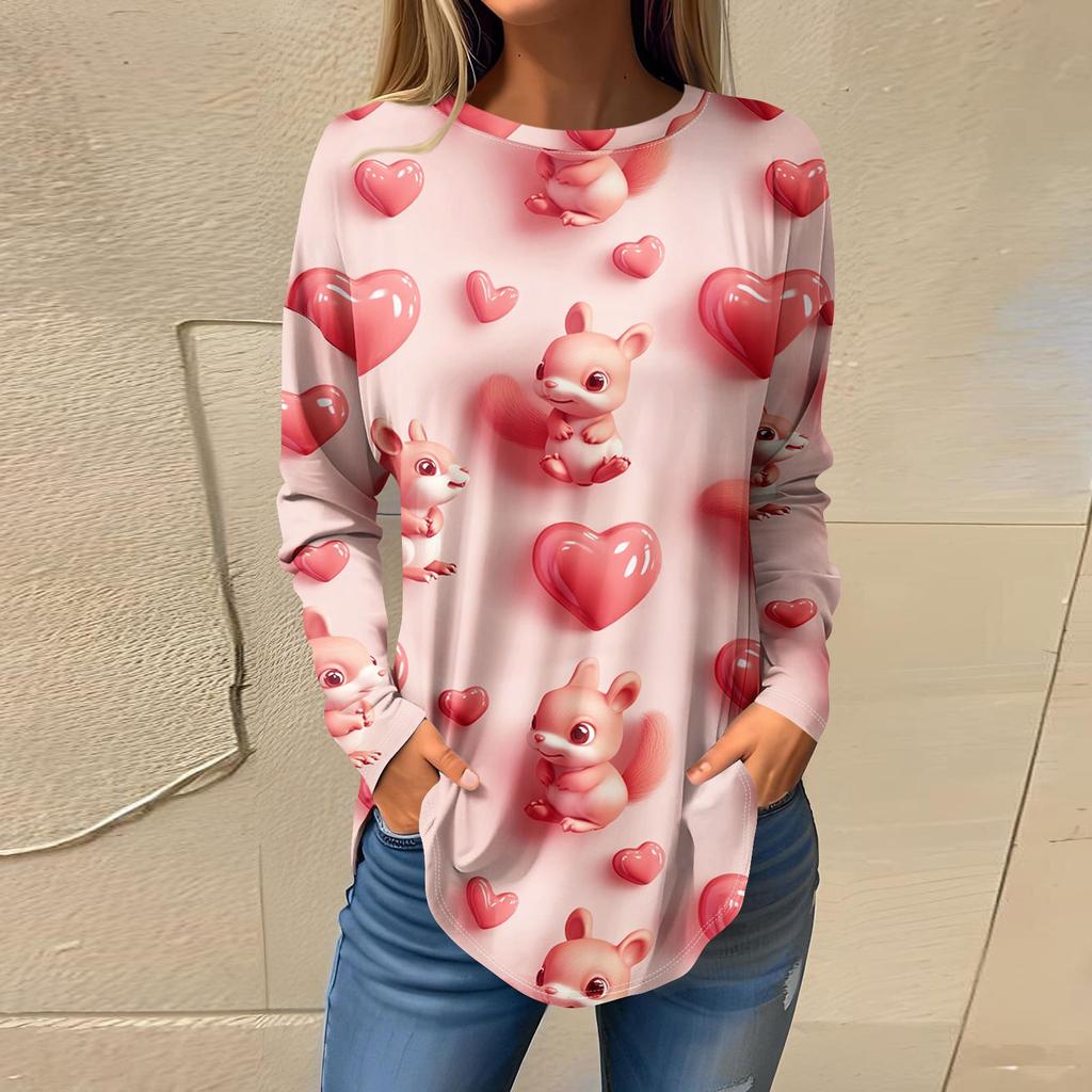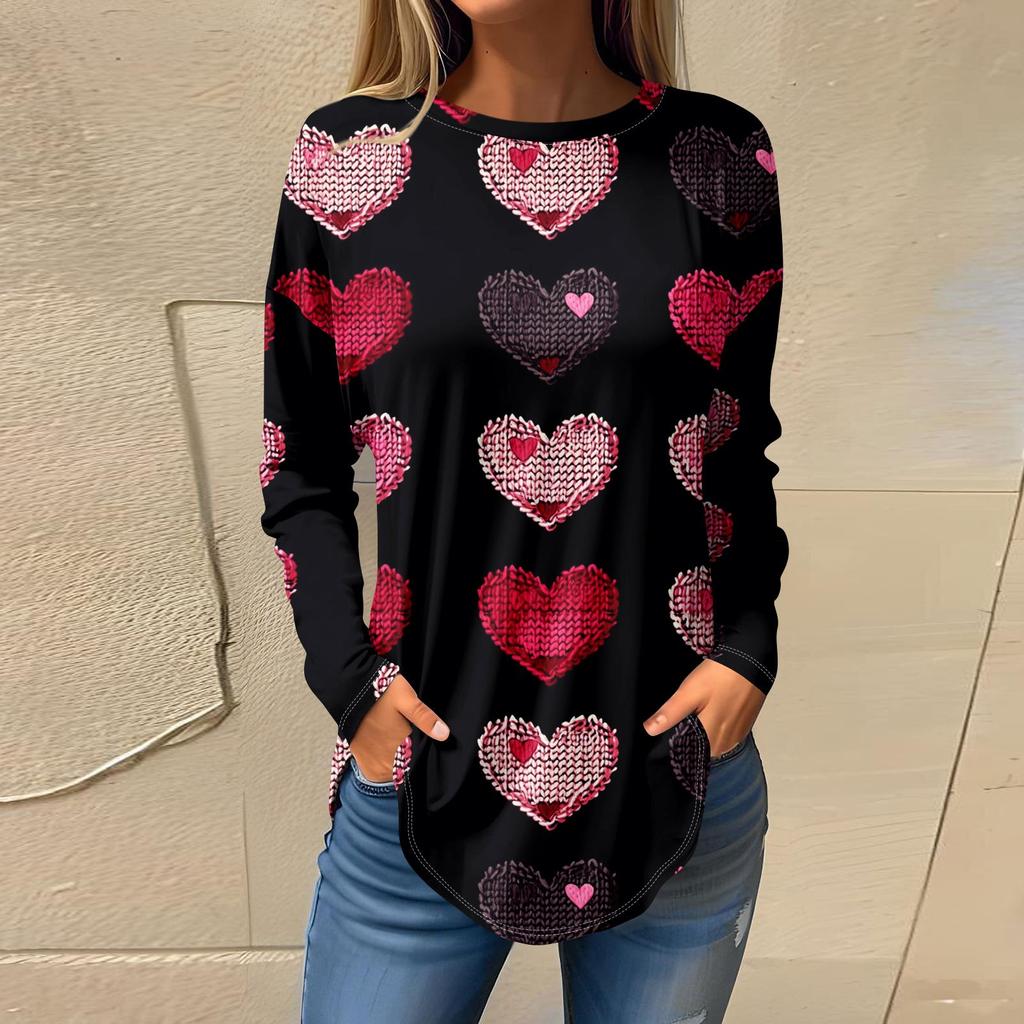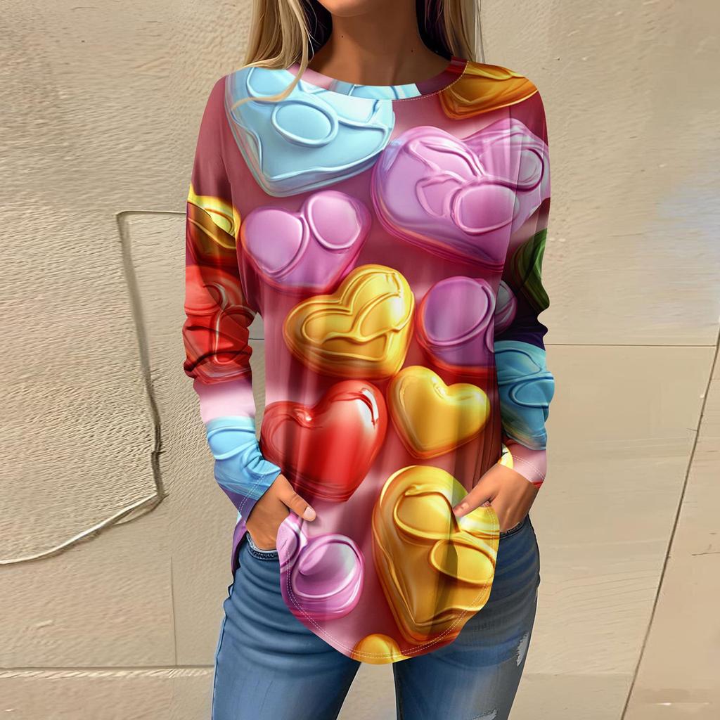 Футболки для женщин Повседневные рубашки с круглым вырезом и длинным рукавом с принтом ко Дню святого Валентина Топ-пуловер